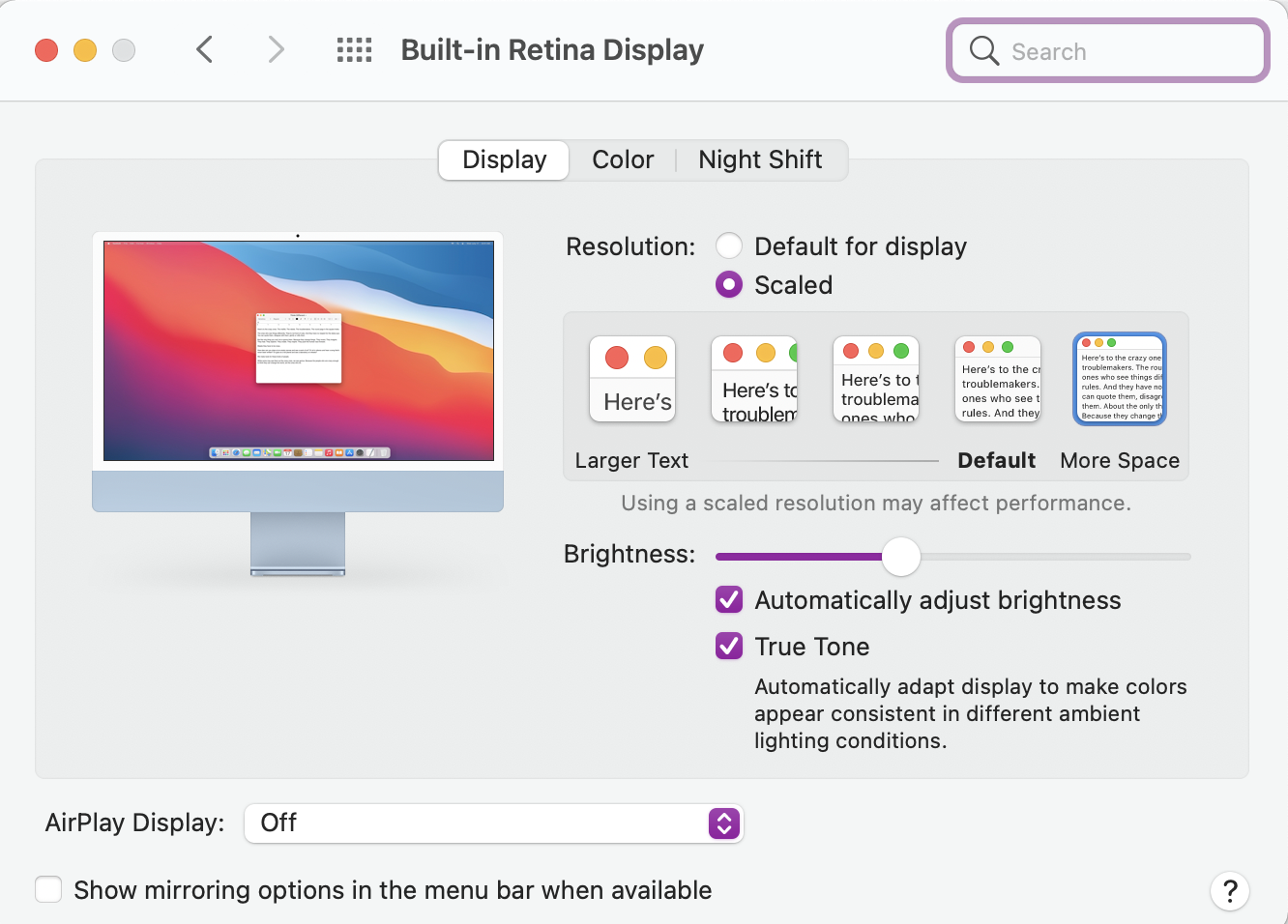 This runs the display in a scaled 2560x1440 mode, giving the same amount of screen real estate as the 27" iMac (in its default 2x mode).
