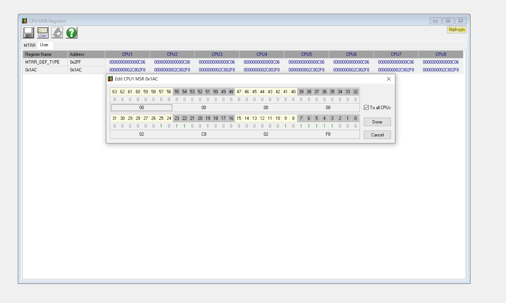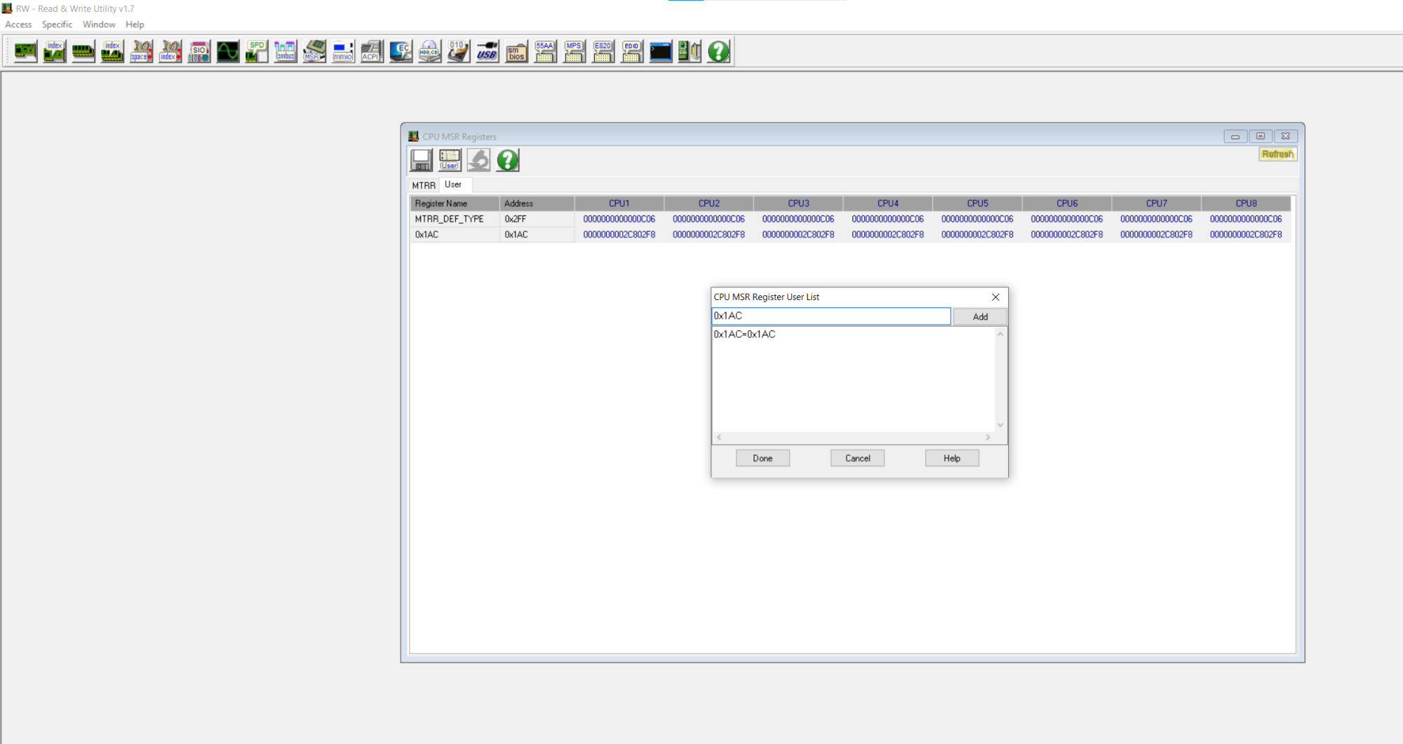 Here is how to use RW everything. Open CPU MSR in the access menu. Click the user tab and then the user button(or F5). Then type 0x1AC, press add and then done. double-click the 0x1AC row that hopefully appeared and then this window will show: