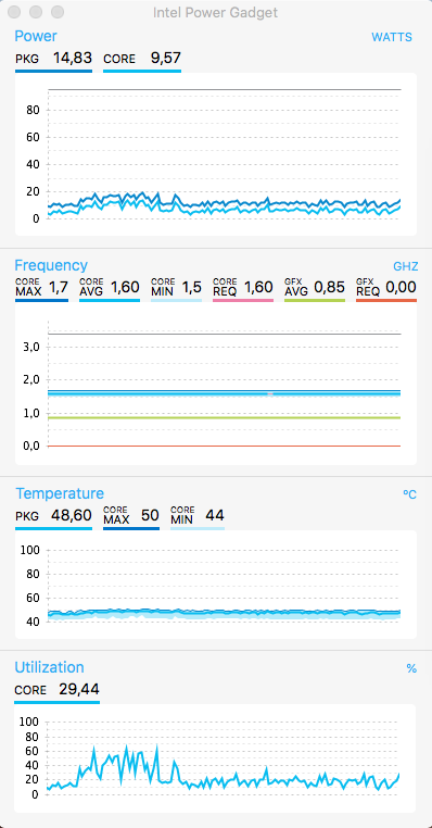 I’m using *Macs Fan Control* and *Intel Power Gadget* for monitoring, but nothing changes: the CPU stays at 1.7 GHz even under load, and the GPU runs at minimal capacity.