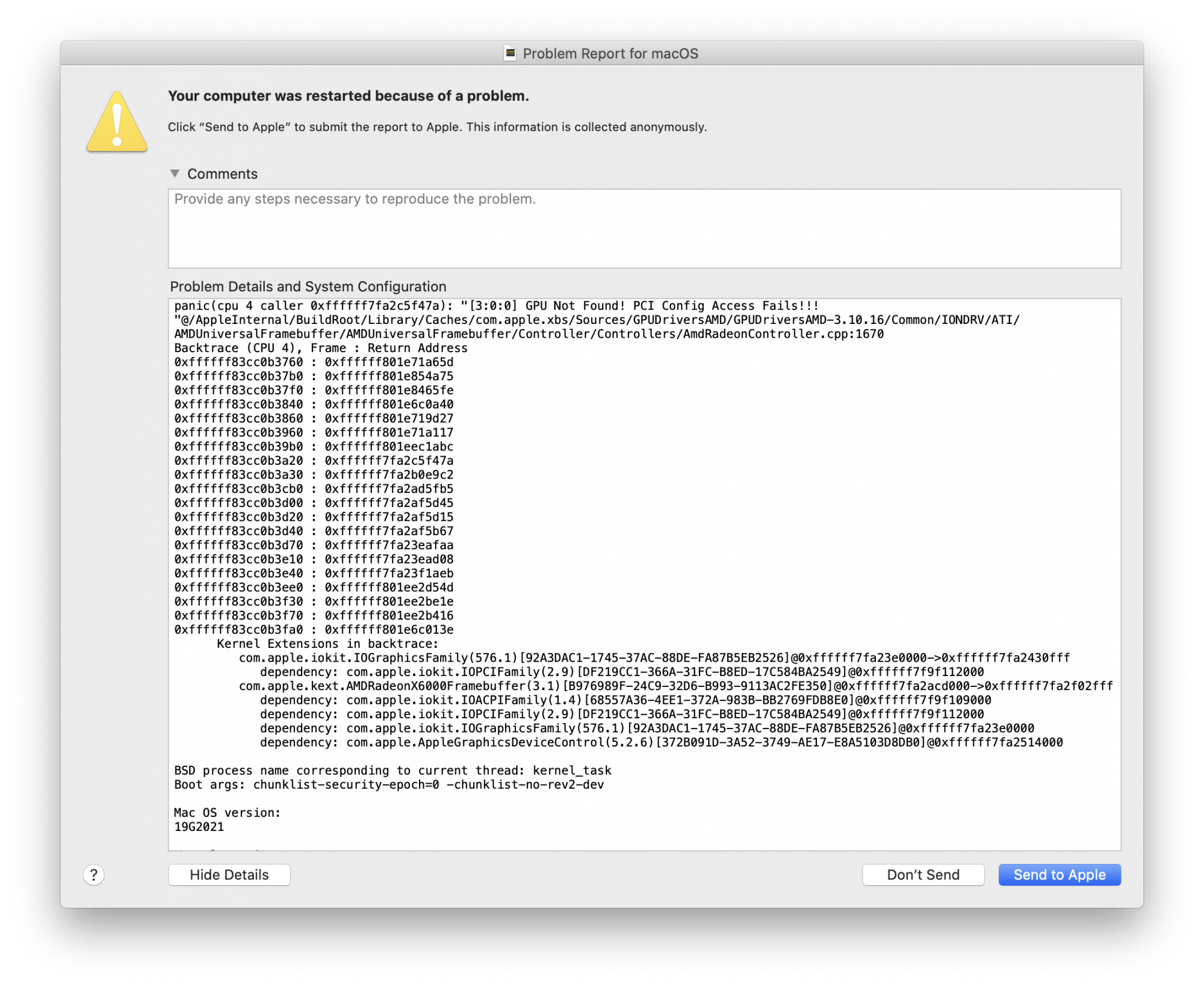 It begins with a rather alarming "GPU Not Found" message. Same exact macOS build as mine, too. Hmm. If you can, post this to the official Apple forum. If you haven't already. To get some Apple eyeballs potentially looking at that. I haven't experienced anything like this. Yet, anyway. Thanks for posting.Yep, that's right — 5700 XT 16GB. Full error report attached (includes lots of references to AMDRadeonX6000).