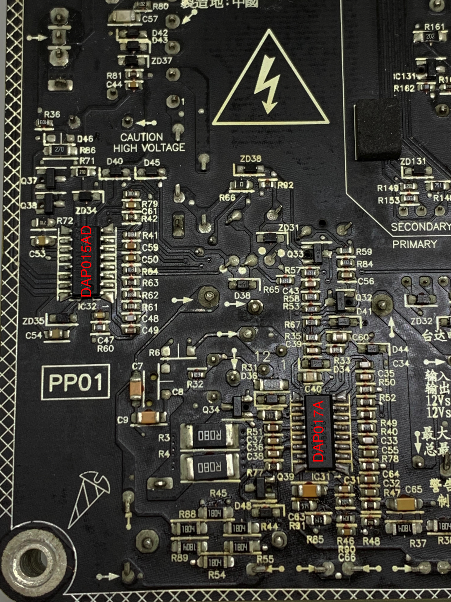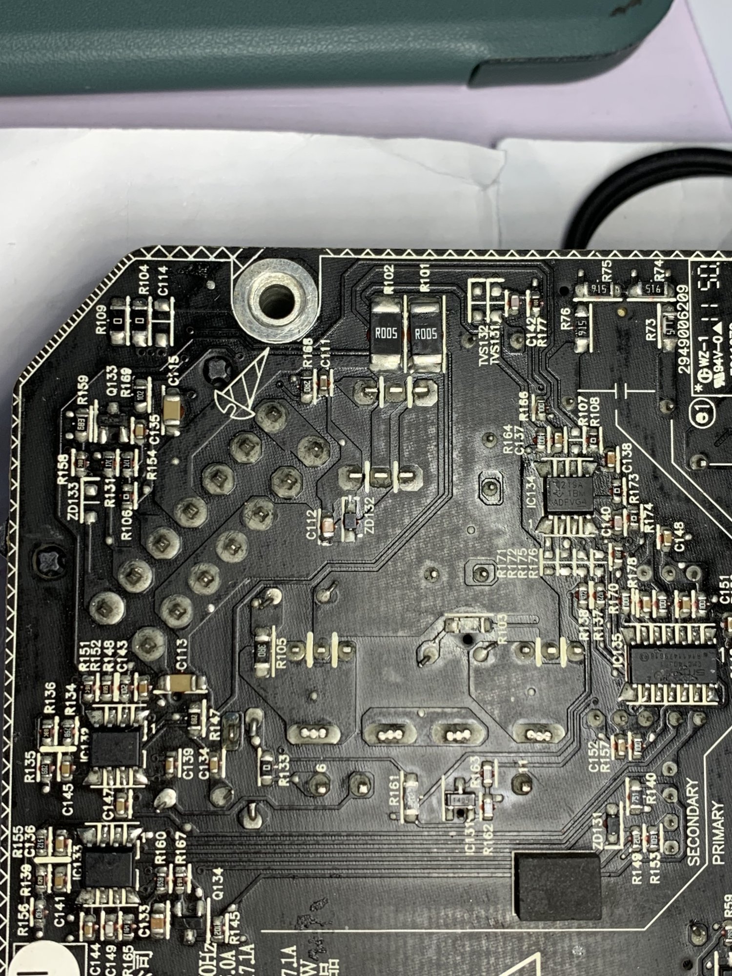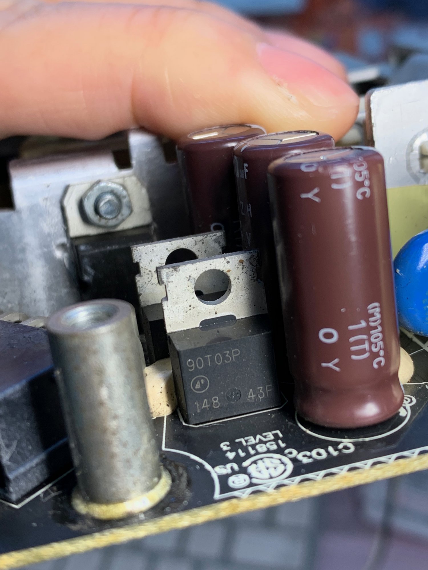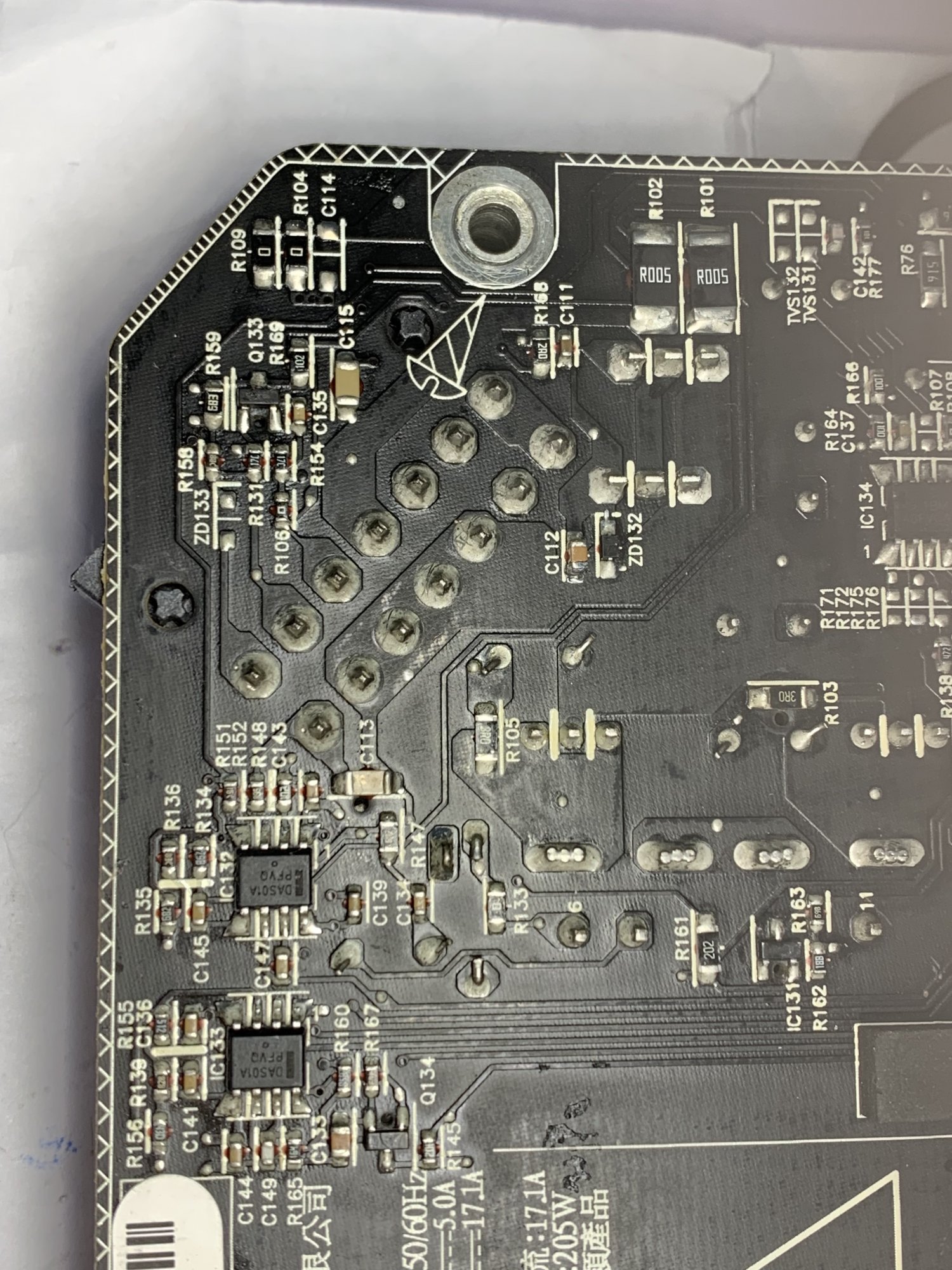 This has left some blackened burnt evidence near the electric shock logo [at C001] as shown in the below picture. (I think that's approximately where the heatsink touched it)