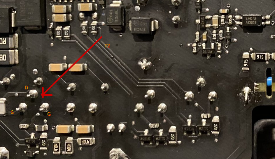 You can also find the two MOSFETS T1 and T3, and I indicated G,S,D.