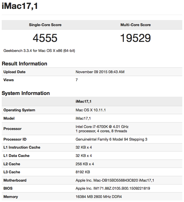 I came across this GeekBench result for a Skylake iMac17,1 with DDR4 RAM