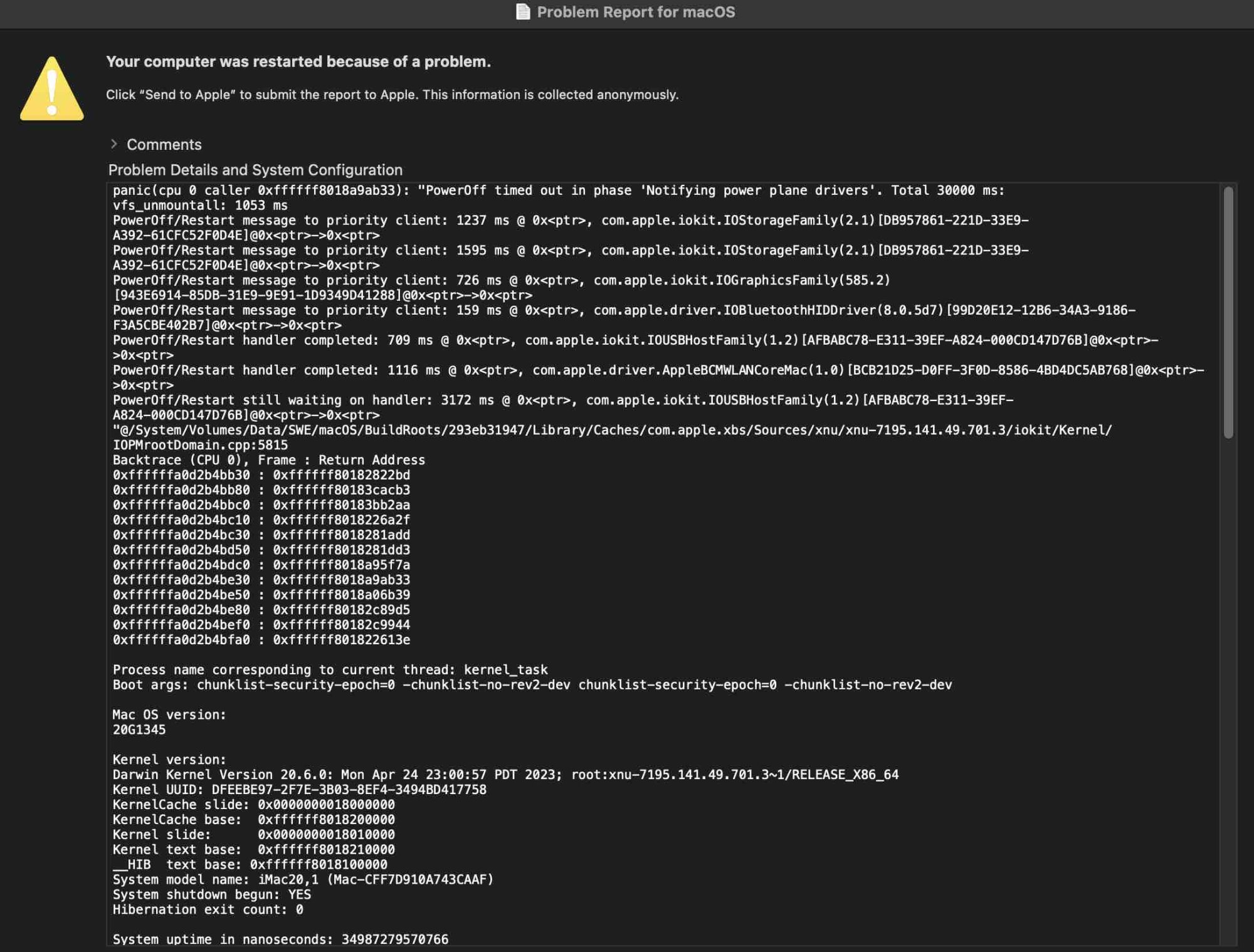 The last few days however to be a little more ECO friendly I've been shutting it down. The screen goes black for a minute or two and appears to have shut down, then it auto starts with a very brief typical kernel panic message, then the Apple logo appearing ok and then the login screen. Just before login I get a prompt similar to 'Computer failed to shut down, send message to Apple Yes/No. It boots ok on selecting No, otherwise gives the kernel panic codes shown below.