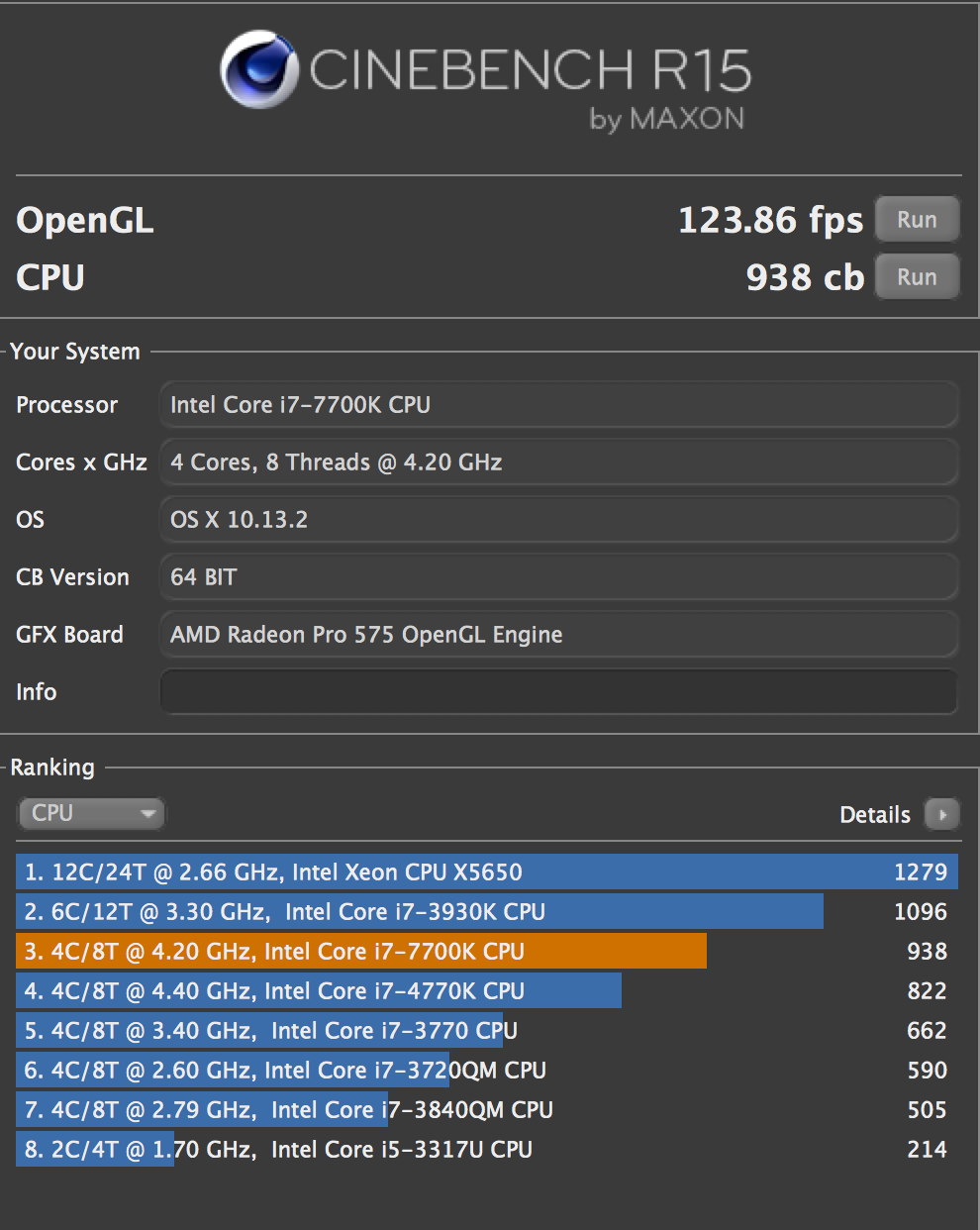 The Cinebench CPU Test is only faster for multi-core jobs. Single-core is faster with the 5k....