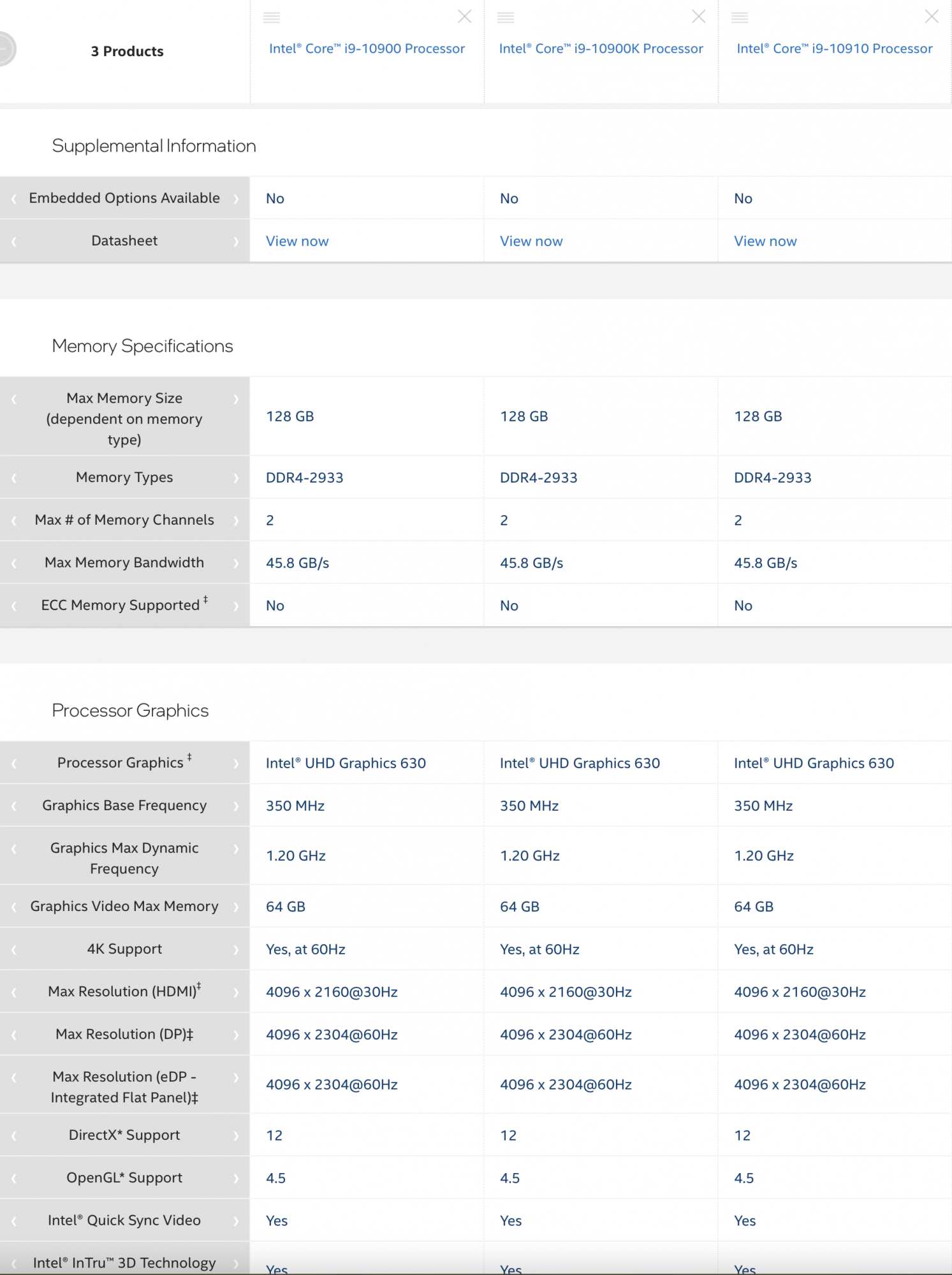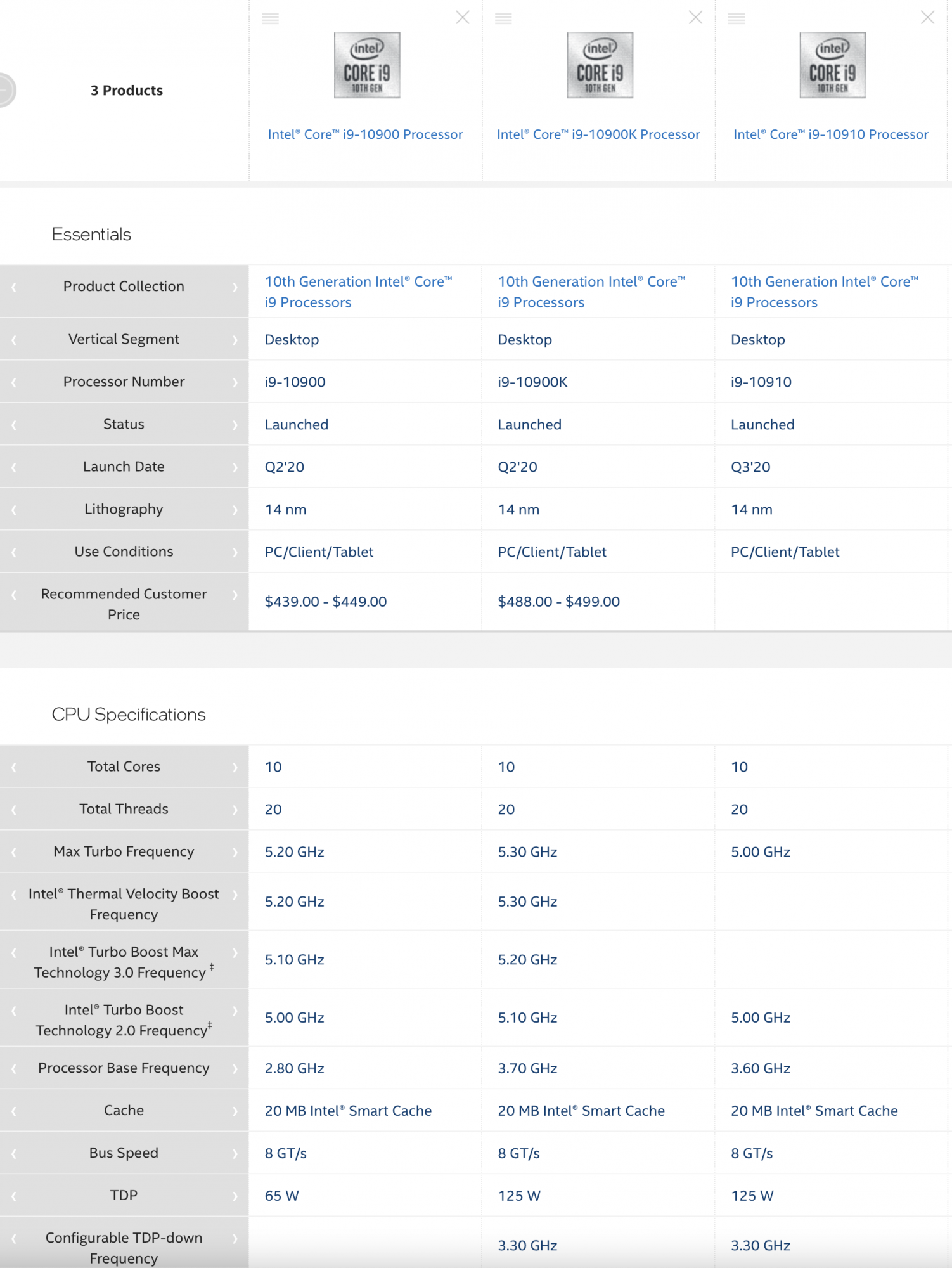 The images are the memory report of my system. At first, I plugged in the 2933MHz memory by itself in A/0 B/0 config. It reported 2667 on power up, however. I reinstalled my original 32GB, and then it went down to 2133. That's a known issue, however, regarding mixing CAS latency (original memory is 18, and the faster is 17). I then put the like memory together into their A/0, A/1 and B/0, B1 then they reported back as 2667MHz across the board. The other shots are from ark.intel.com, and compare the 10900, the 10910, and the 10900k. There's another panel on the website that speaks to the turbo boost differences, that I didn't snap. In this configuration, I get about 1300 for single core, and about 10k for multicore in Geekbench 5.