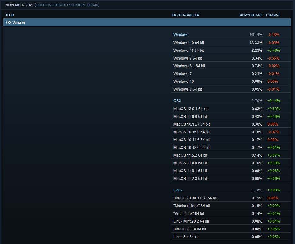 In short, Windows use is higher, I'm assuming because of all the AMD Ryzen rigs being bought (Valve broke their active accounts record like 4 times), pushing down Mac and Linux use. In the latter part of 2021, Linux use started to climb again, passing the 1% mark.