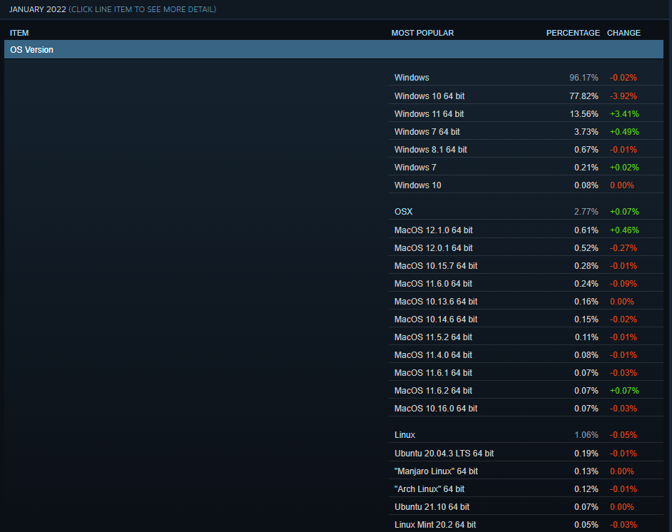 +0.07% increase from last. Going to screen shot for historical reference. Will be interesting to see if Linux surpasses with Steam Deck release. Linux is already up 0.03% from developer Steam Deck units which is probably like single digit % vs consumer units.