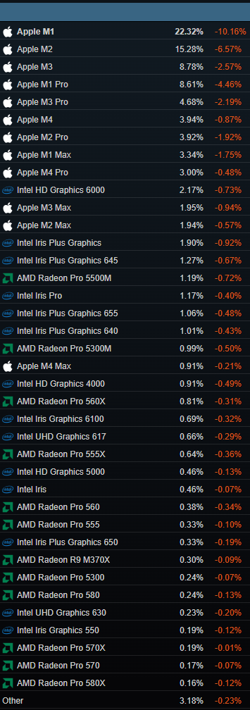 I’m not sure what ”cult mentality” has to do with the subject either. So just because people disagree with you they’re part of the Apple cult? Even if everyone agreed with you it wouldn’t change the situation. Isn’t it cult mentality too to think that the developers shouldn’t have to do anything and Apple is the only one who needs to do all the work and has to change its entire SW/HW strategy to fulfill the needs of a fraction of 1.41% of Mac gamers who can’t play a small part of old 32-bit Mac games for free? How many times have you seen actual Mac gamers complain about the subject here on MR? I can only recall a few times during the past years when people asked for help to make things work. All other times the ”complaints” have come from Windows/Linux/Steam Deck gamers.
