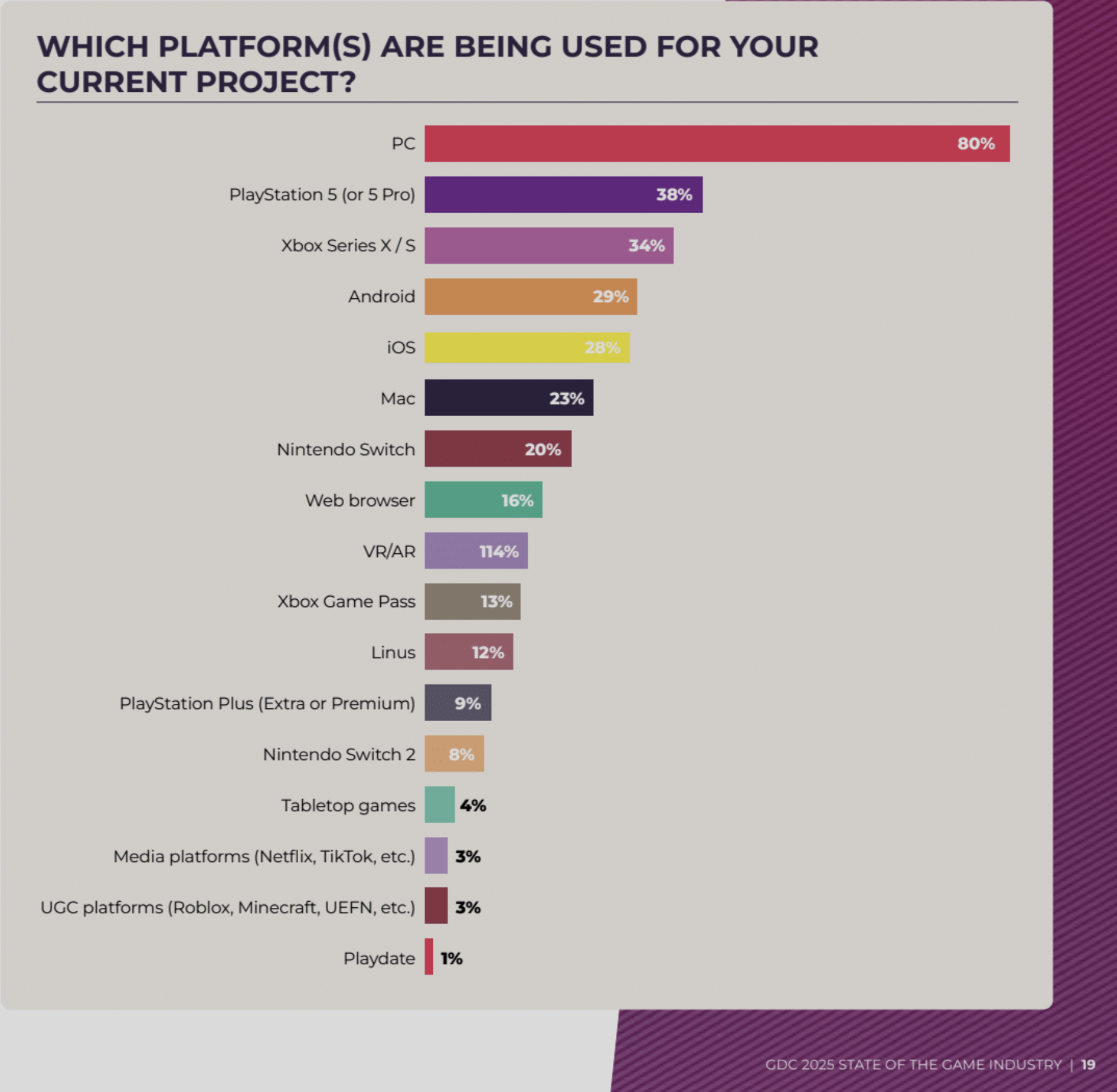 Another more accurate way of measurement is the number of released Mac games. Steamdb shows that on the contrary more Mac games have been released each year since 2019 with a record-breaking of 6238 games last year, only on Steam. So why are developers releasing more and more AAA/AA/indie Mac games in different stores if Mac market share is shrinking according to some PC gamers? Because as explained above Steam stats don’t show the important truth and developers rely on their experience and other metrics, not Steam survey. In 2023 16% of the devs at GDC were working on a Mac project. Last year the number increased to 23%, surpassing Switch projects.