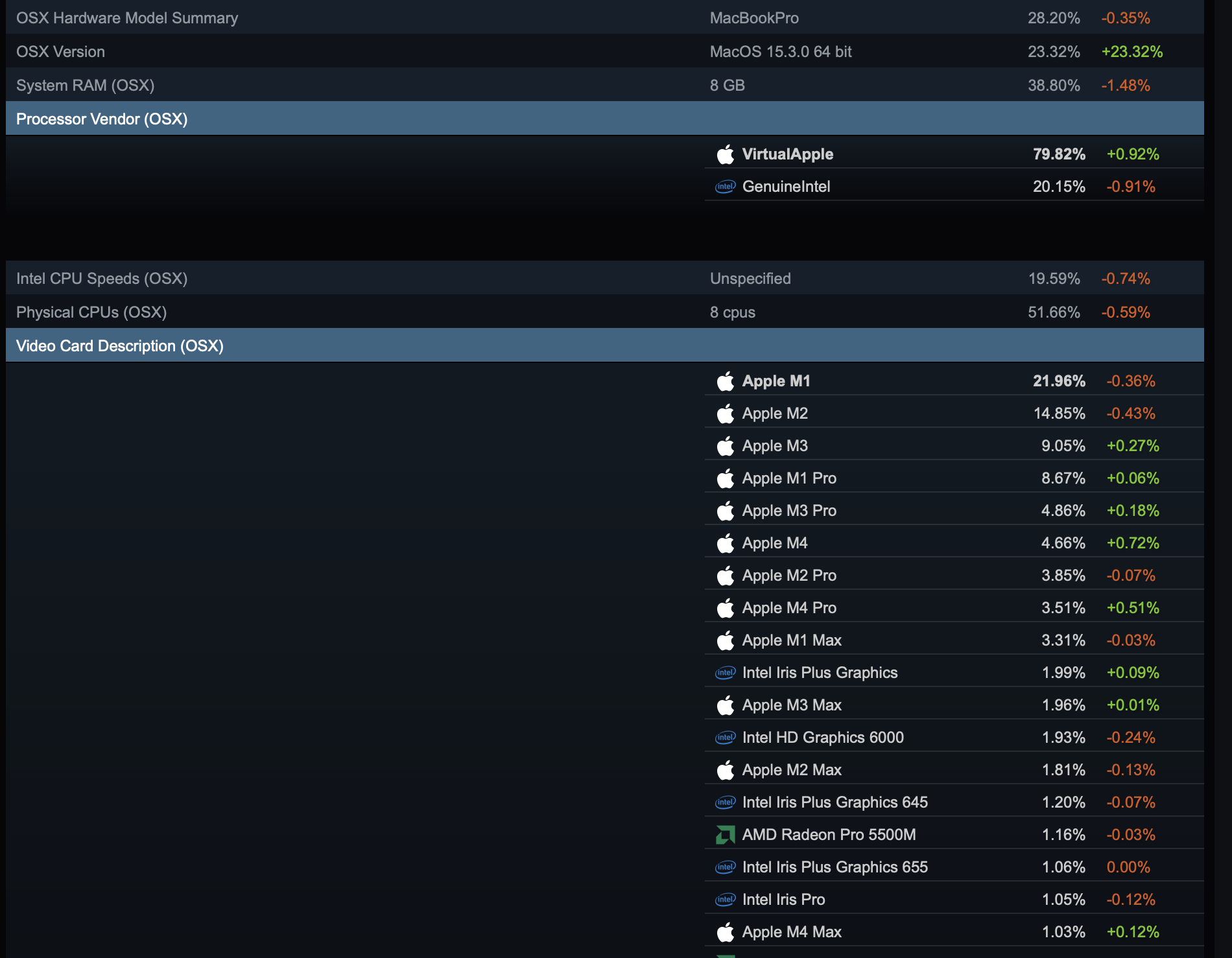Surprising to see people still using Steam statistics without fully understanding the mechanisms and data behind it despite all previous discussions and explanations. With different comparison points statistics can show something meaningful and relevant or something misleading and useless. It all depends on the point of view and the purpose. When it comes to Mac gaming it’s no news that some people always tend to pick the worst comparison points for some strange personal reasons.