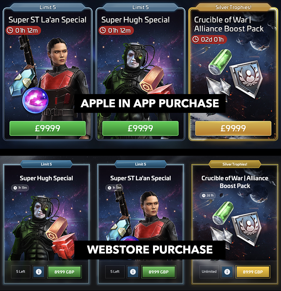 This is Star Trek Fleet Command. In-game iOS £99.99. Webstore £89.99. Each pack carries a £10 Apple premium. This is wrong. Epic have a point.