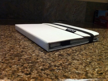 The materials are really nice and it seems like it would stay in the intended position well. One odd thing is that part of the case that goes against the screen isn't the microfiber material. It's the part that you use to stand it up. Also, it didn't work with the screen protector that I have on right now (wrapsol, which is pretty thick).