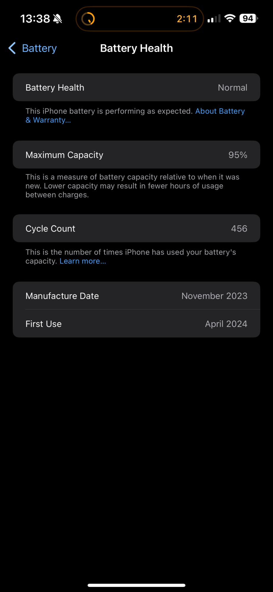 For instance, my 14pm purchased on launch day, the first is the shortcut, the second apple’s battery info: