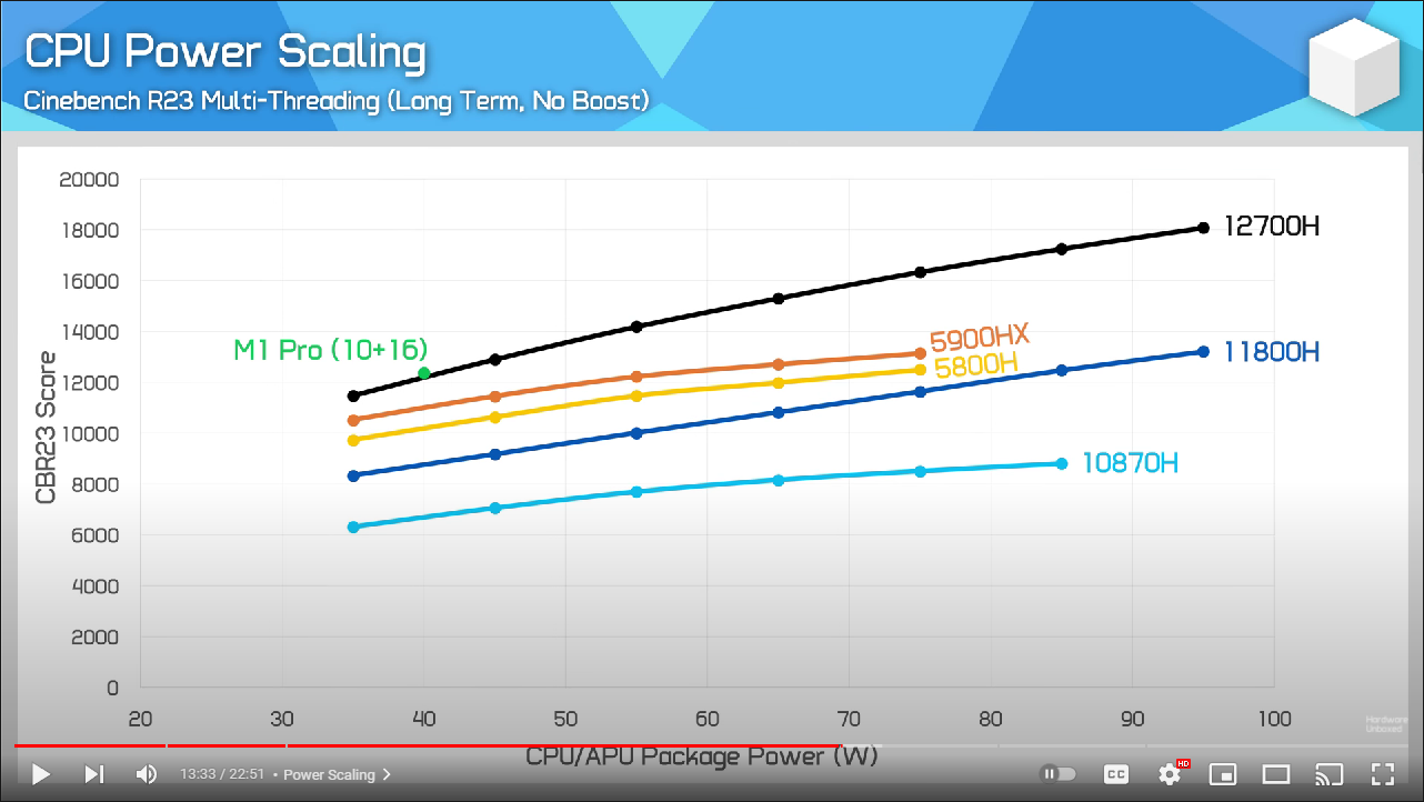I’m not sure that’s actually true (unless you mean pumping additional power through the M1 Pro/Max CPU which Apple doesn’t allow). Given the differences in architecture, I would say that a higher core count M-series chip would scale far better on perf/W than Alder Lake on this graph.
