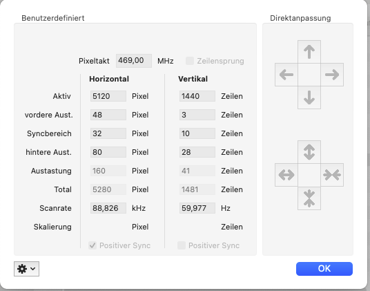 For confirmation evidence, we need timing info from SwitchResX showing pixel clock and active pixels of 5120 or a photo of the onscreen menu of the display showing 5120 width.