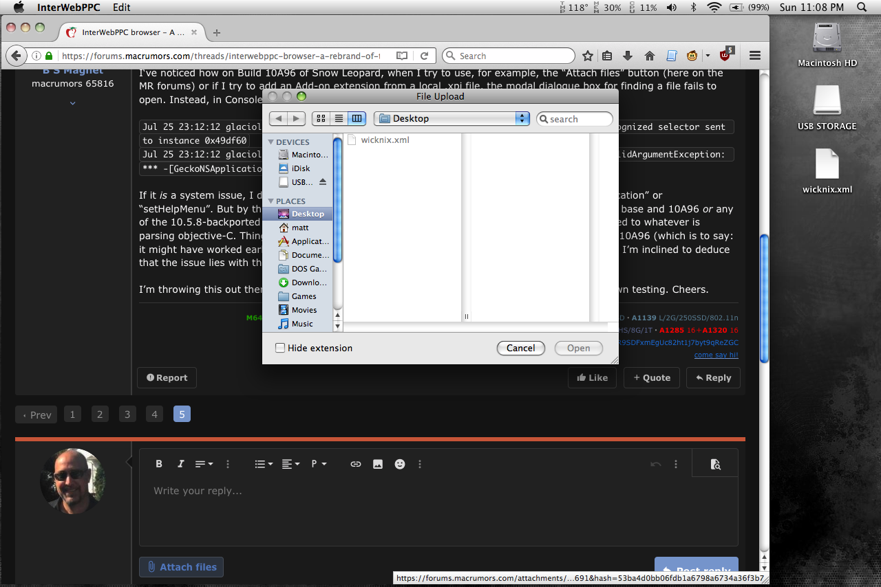 I‘ve noticed how on Build 10A96 of Snow Leopard, when I try to use, for example, the “Attach files” button (here on the MR forums) or if I try to add an Add-on extension from a local .xpi file, the modal dialogue box for finding a file fails to open. Instead, in Console, this particular message appears: