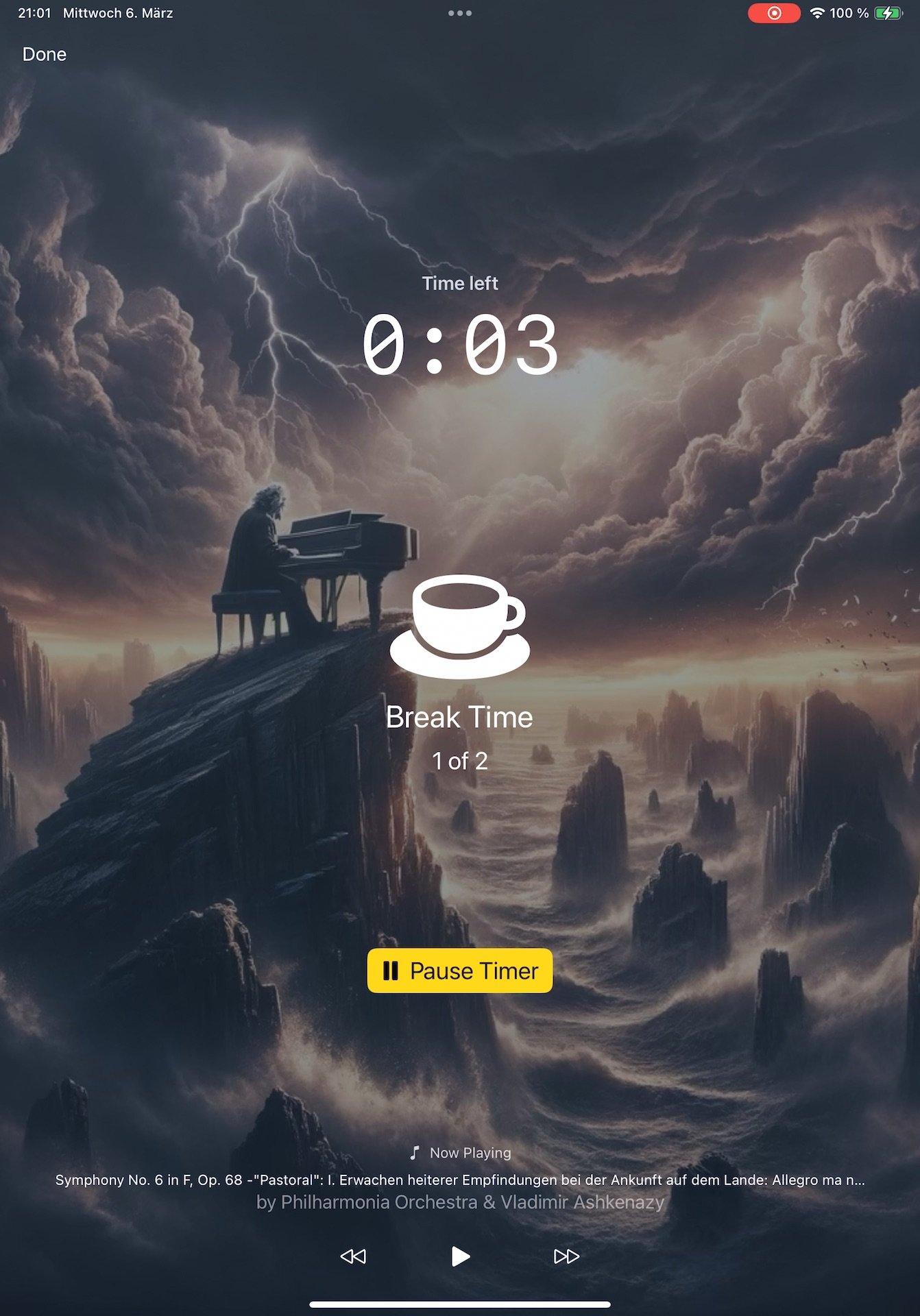 You like to work with background music? And you want to improve your productivity with the Pomodoro (25m / 5m) technique? Then my new app is what you've been waiting for: FocusBeats provides selected themes for music like movie soundtracks or classical music. And automatically plays & pauses the music during focus & break periods. Discover focus music for every mood!