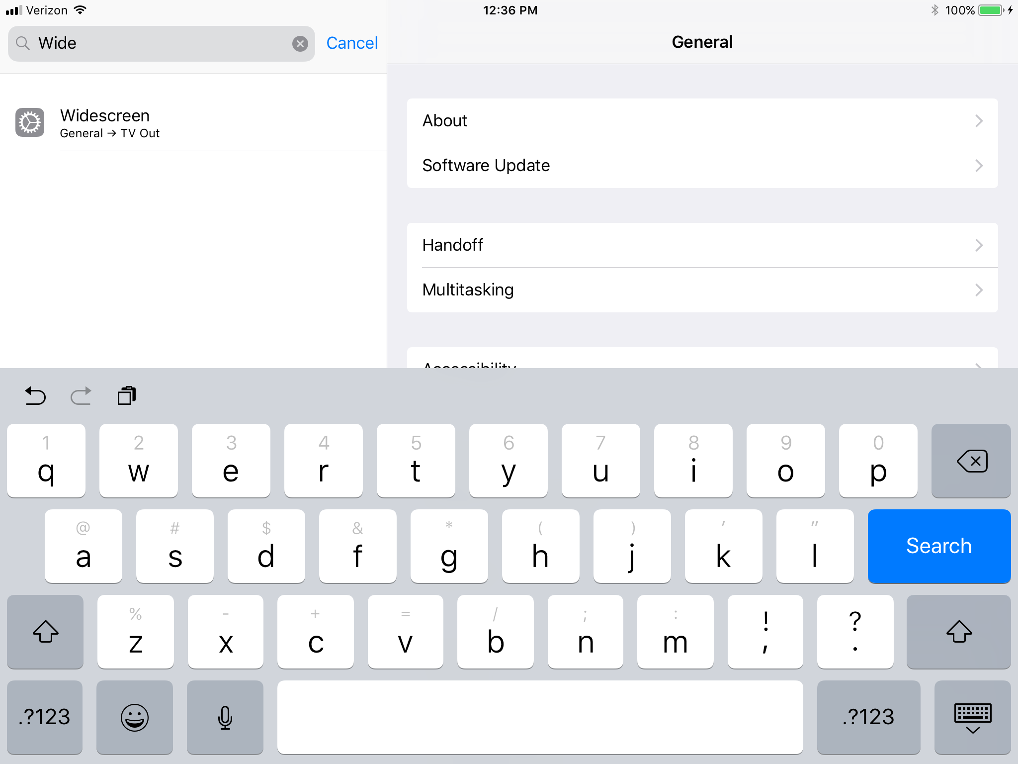I was poking around in the Settings app today and found a not-yet-enabled(?) setting that may fix or address a longstanding removed feature of iOS 6 - widescreen TV output. Screenshot, only found using the search feature of the Settings app on my 12" iPP: