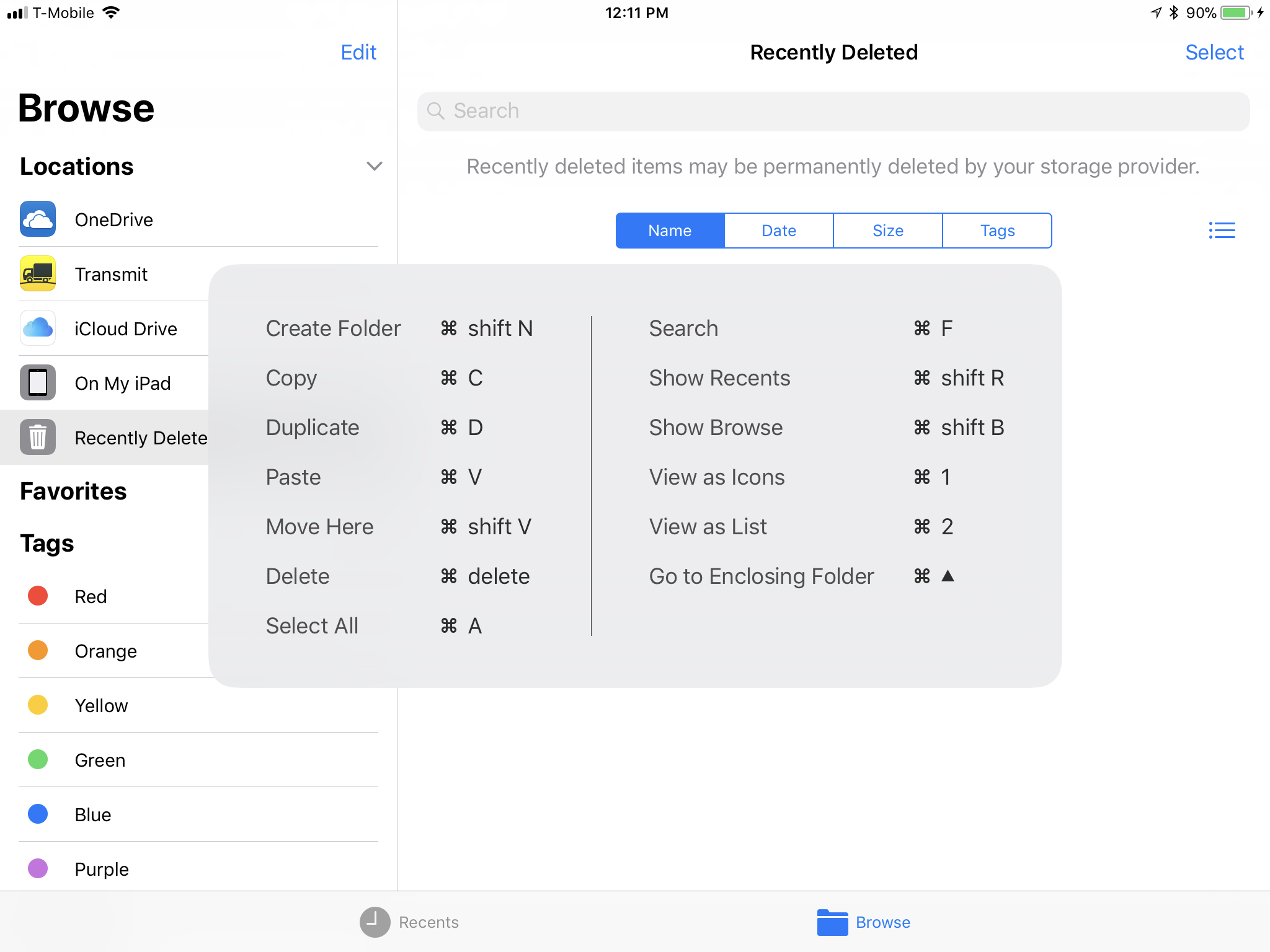 Here they are. Unless I’m missing a way to go in to select mode on the keyboard they seem pretty crappy though. You have to enter select mode by tapping the screen then tap each file individually (unless you want to select all of them with Command A) before Copy, Duplicate and Delete do anything or make any sense. At that point you may as well just tap the same buttons on the screen. Keyboard workflow for Files needs a LOT of work to be useful.