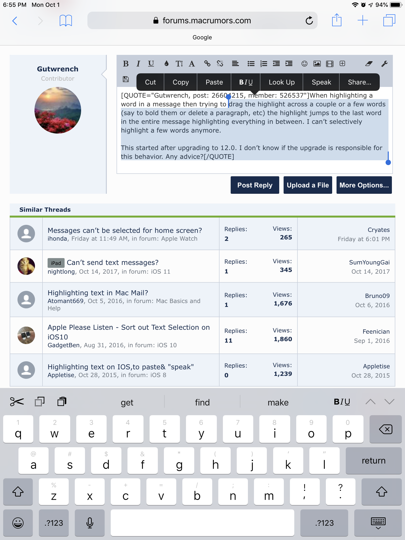 I’ve noticed that since the iOS 12 update, on my iPad, I can no longer control the selection of a group of words. I can select a single word, the entire post, but if I try to drag the selection handle, my selection jumps to the end of the post. I can’t drag the selection over just a few words. I realize this may be an issue with iOS 12 that is out of your hands, but thought I’d mention it in case you can do something.