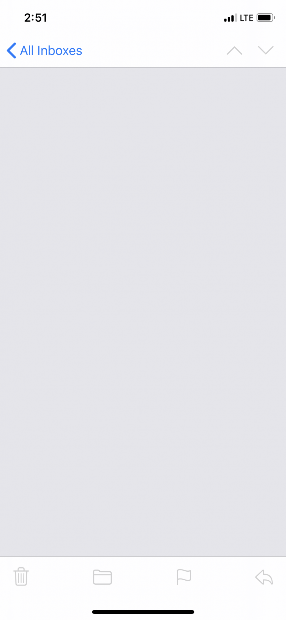 When tapping an email notification to enter the Mail app, then tap the Trash icon delete said email, the app no longer brings you back to the proper mailbox. Instead, it sits on this gray screen: