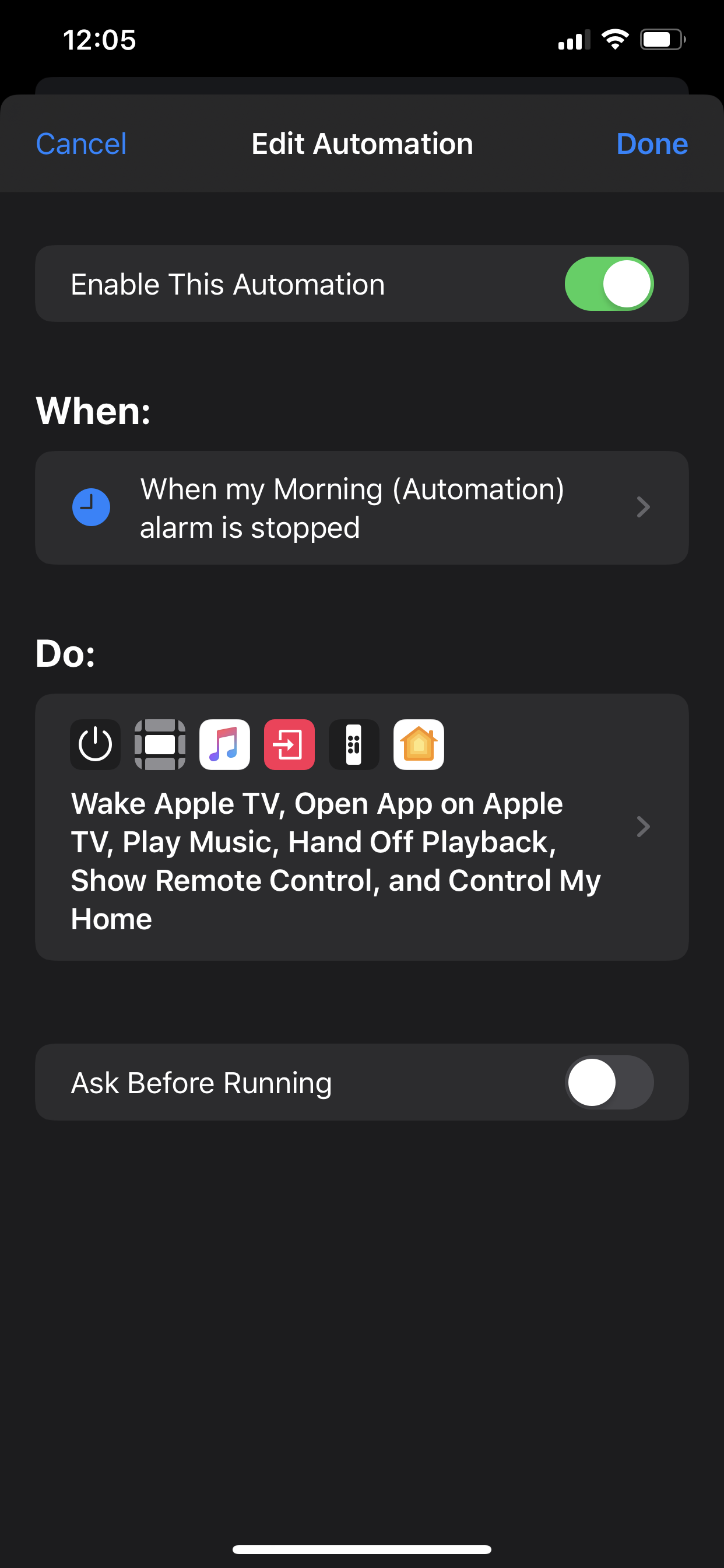 Umm, you’re probably talking about a particular part of the shortcut automations, but I want to make sure everyone understands there are actual automations. I have one that turns on my Apple TV and plays music from the AppleTV natively when I turn my alarm off. I unchecked “ask before running” and the automation does indeed occur automatically.
