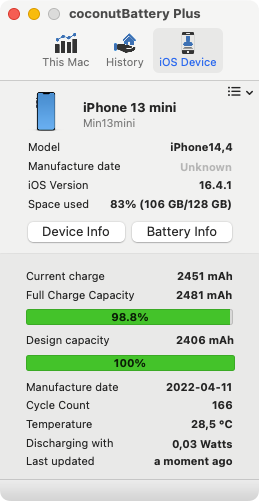 If they’re that accurate then why does it fluctuate so much as the SoC increases? Shouldn’t it be one number top-down?Not quite. Apple doesn't report battery levels or battery health in detail in its GUI, those are just general (cheerful) figures. For instance, I have a 13 mini, which after 166 load cycles is still well above even its design capacity, see attached screenshot from coconutBattery Plus. Mainly because I have charged it between 20 and 80 percent only. Such a regime greatly improves battery performance overall. But the fact that the battery's full charge capacity is above its design capacity is just down to luck, not one battery is chemically identical to another. Now, please don't second guess coconutBattery's stats, they are legit (the app uses iOS's own internal measurements).