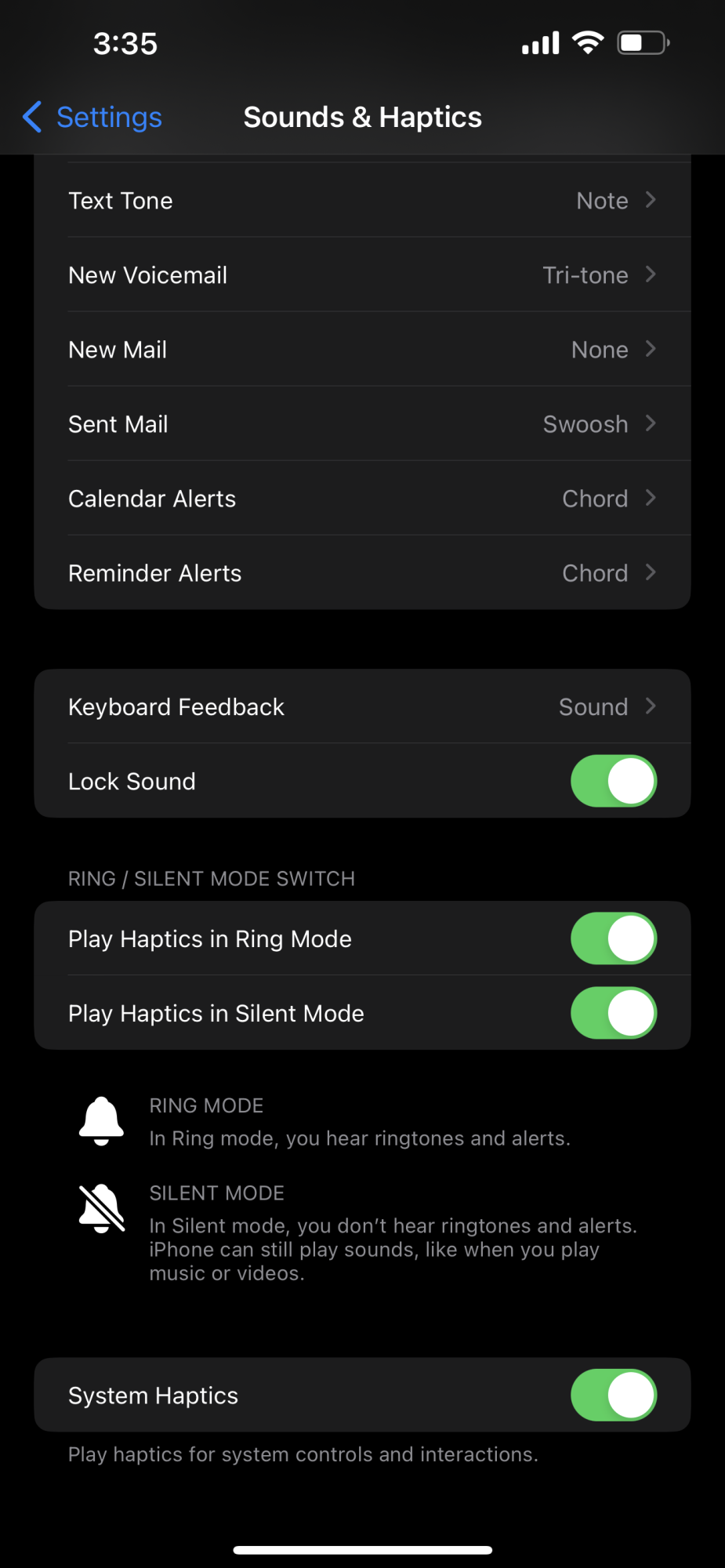 My 13 is the same, no KB haptics even when enabledThanks, I’ve tried that to no avail. Restarted the phone too. No keyboard haptics at all. Weird.