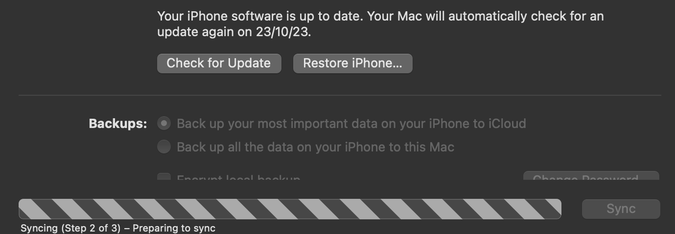 iOS 17.0.3 syncing with macOS Sonoma Finder remains stuck at status message - Syncing (Step 2 of 3) - Preparing to Sync. The iPhone is connected by cable to macOS Sonoma running MacBook and syncing of logs is attempted on MacBook.