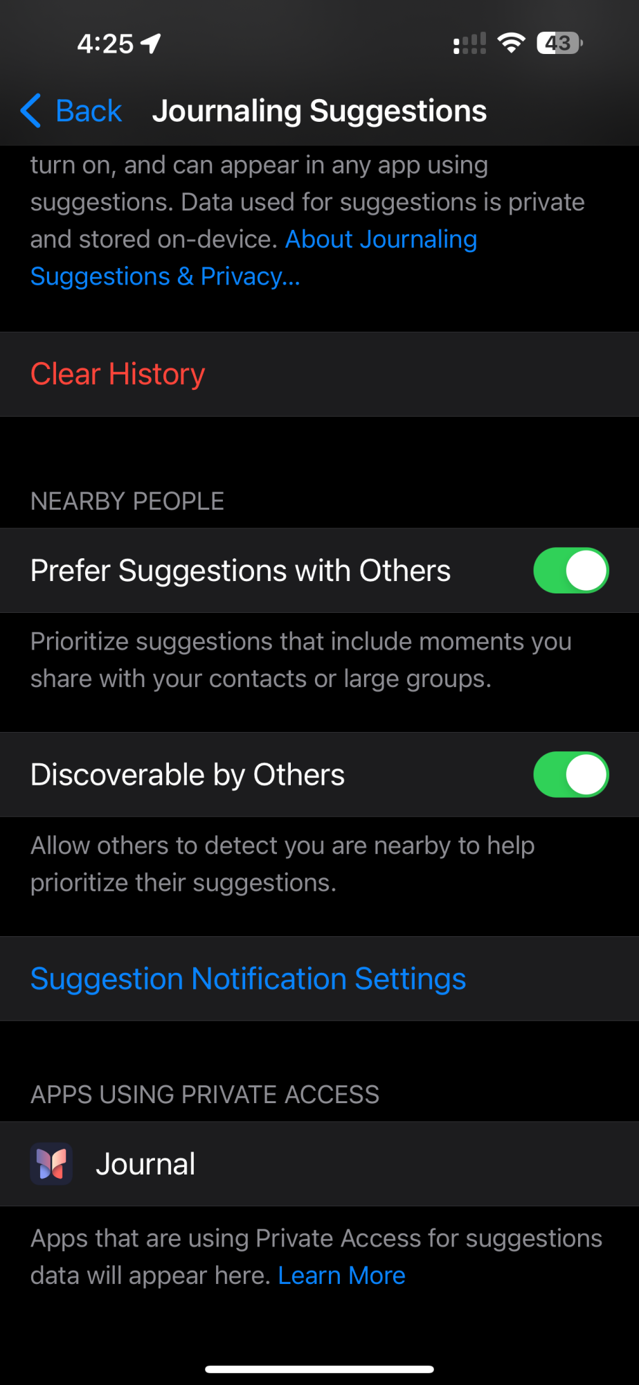 Take a look at your “Journaling Suggestions “ settings under Privacy. Looks like having Significant Locations enabled could open up more suggestions..Haha I thought it would ask for your mood throughout the day and then use your selection with AI to make automatic suggestions to improve your health or something like that.