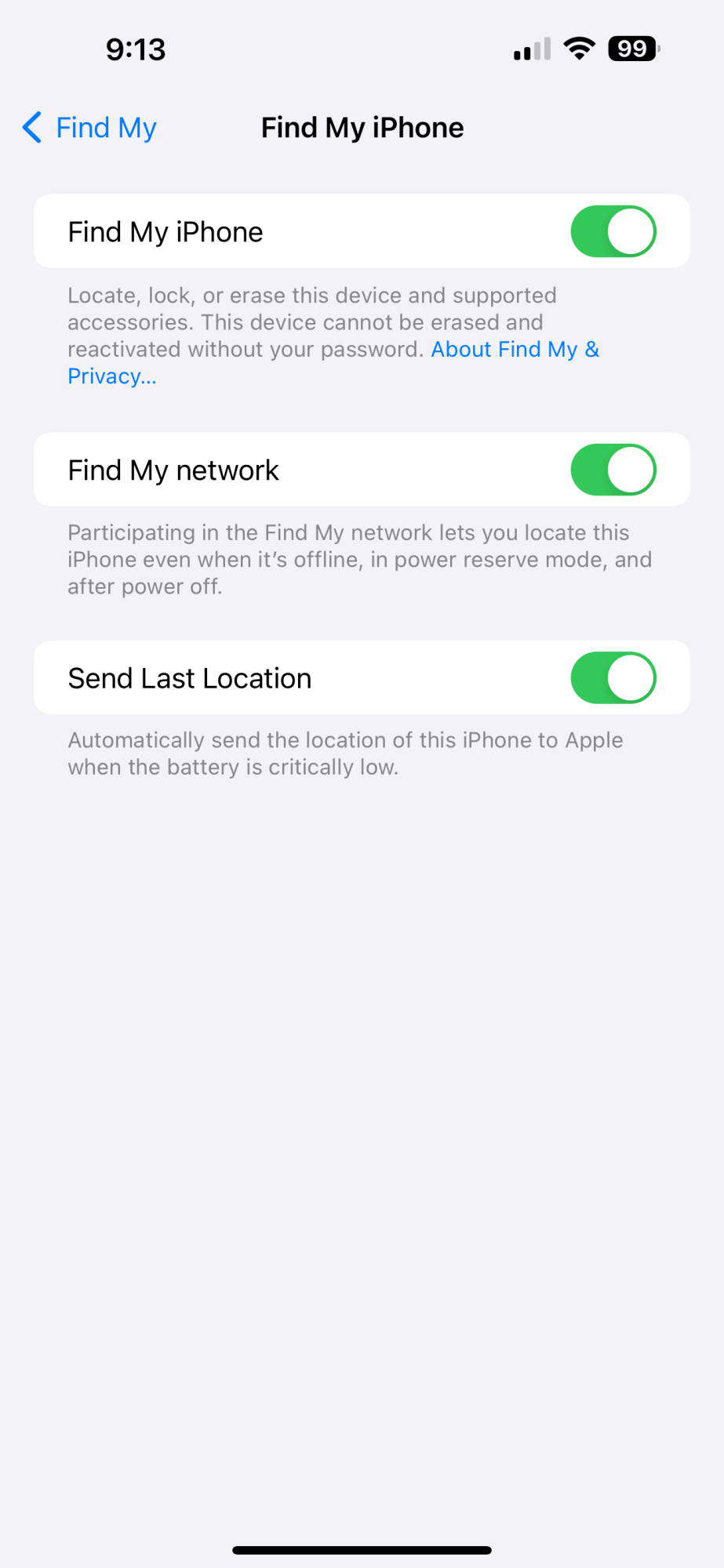 Yes, they are all enabled.Settings > Tap your name at the top > Find My > Find My iPhone >