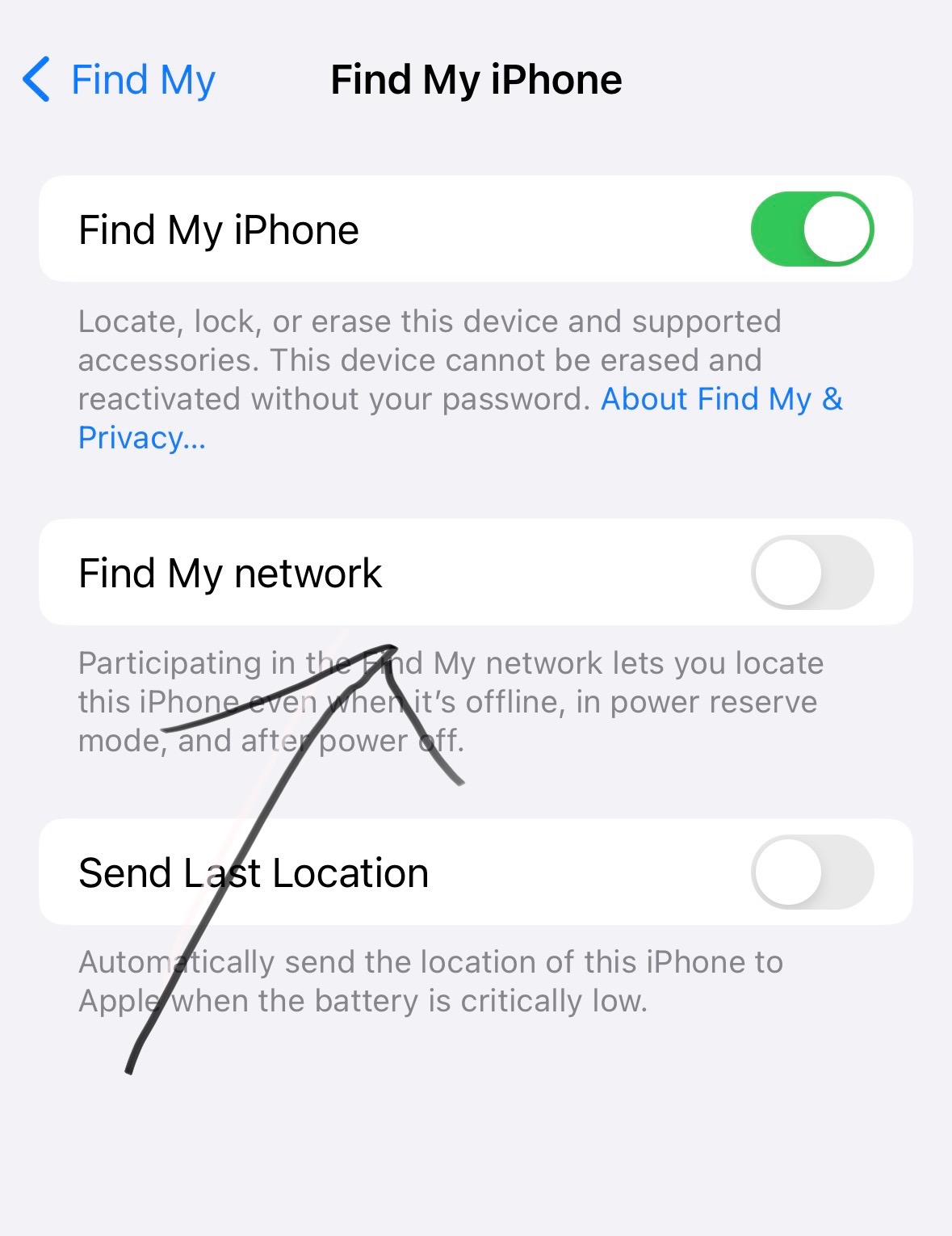 I apologize, I thought you were referring to "find my device". Where is "find my network" located? Join networks?i have find my iphone enabled as well but "find my network" disabled. i've been doing some testing with the "find my network" enabled and disabled and have still not come to a full conclusion as to how much it affects overall battery life but it does seem to have an effect. i'll post about it when i find out more in terms of just how much it affects battery life