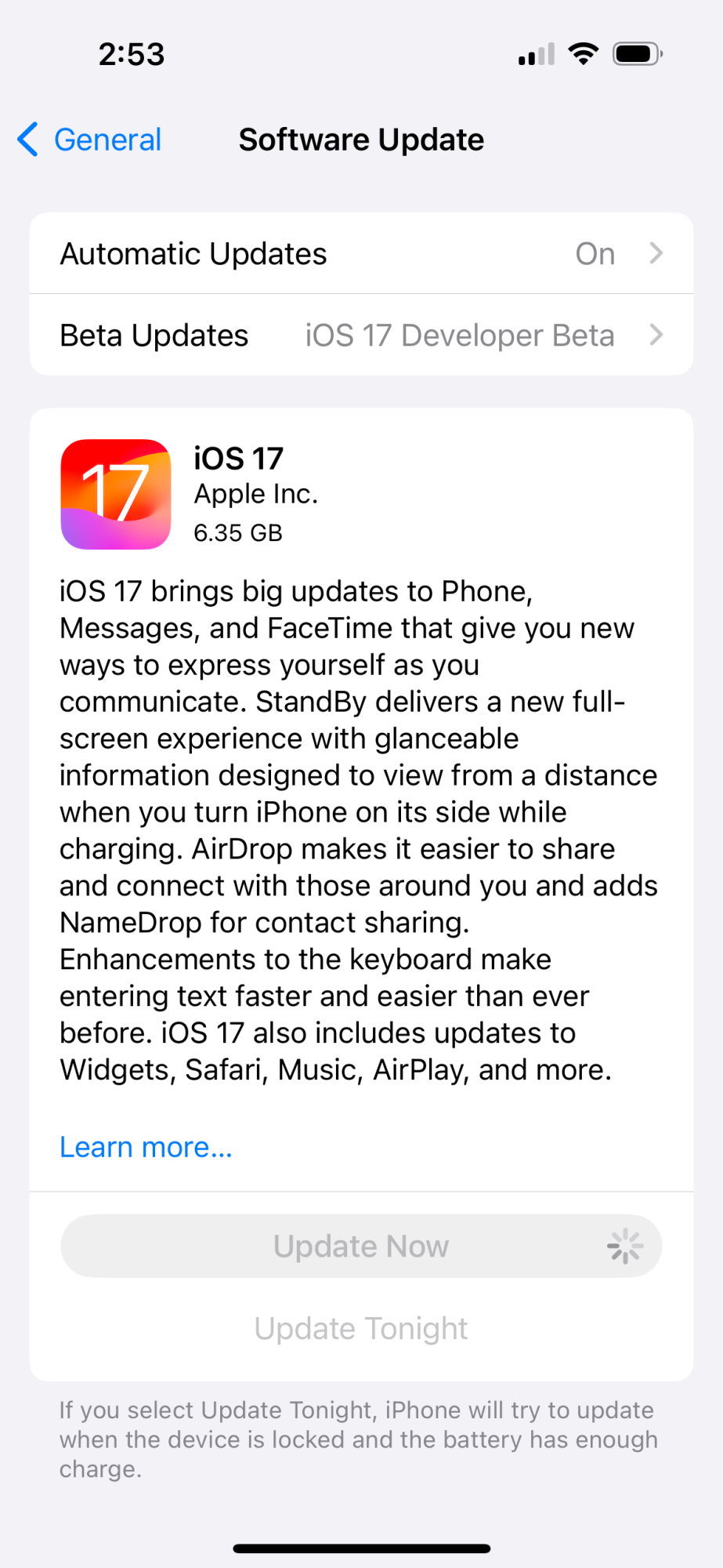 iOS 17 brings big updates to Phone, Messages, and FaceTime that give you new ways to express yourself as you communicate. StandBy delivers a new full-screen experience with glanceable information designed to view from a distance when you turn iPhone on its side while charging. AirDrop makes it easier to share and connect with those around you and adds NameDrop for contact sharing. Enhancements to the keyboard make entering text faster and easier than ever before. iOS 17 also includes updates to Widgets, Safari, Music, AirPlay, and more.