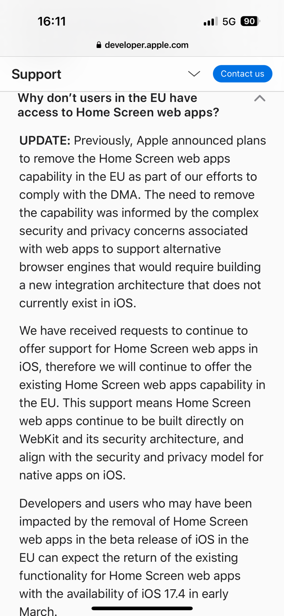 I think they initially decided to pull PWA support because it was unclear whether or not the EU would deem there limitation to WebKit as self-preferencing, and decided to reincorporate when they got assurances that it wouldn’t conflict with the DMA. That’s at least my guess. Maybe they’ll improve PWAs in iOS 17.5! 👍🏻Makes total sense to keep PWAs on WebKit, as before. This might actually encourage users to stick with Safari, which is good for Apple. 👍