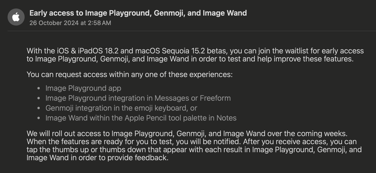 I ended up rolling back to 18.1 RC. Didn’t have a bad experience or any showstoppers but since I can’t use the image playground stuff after waiting since release there isn’t really an upside except for ChatGPT/Mail improvements. Mail improvements were buggy for me, not getting notifications for some despite having ‘All Messages’ selected. That coupled with the normal beta battery drain made it kind of meh for me.