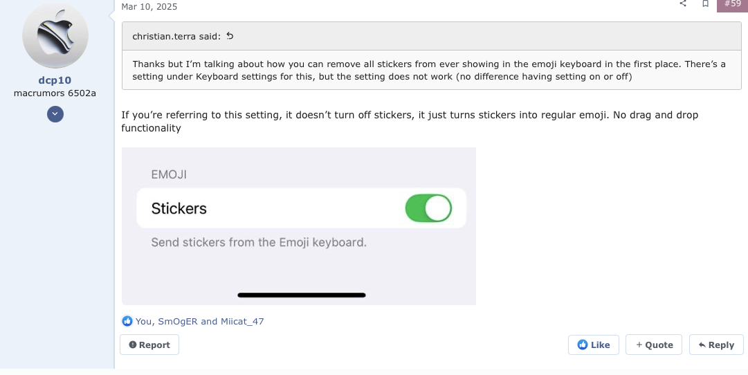 It has to be a bug because why would they still have the setting? Switching the setting to "off" does nothing. The only thing I can think of is that they will remove the setting and permanently keep stickers in the emoji keyboard because without stickers "on" you cannot access genmoji.It’s not a bug, it’s intended I believe - Apple would say „it’s not a bug it’s a feature“ 🤣🤣🤣
