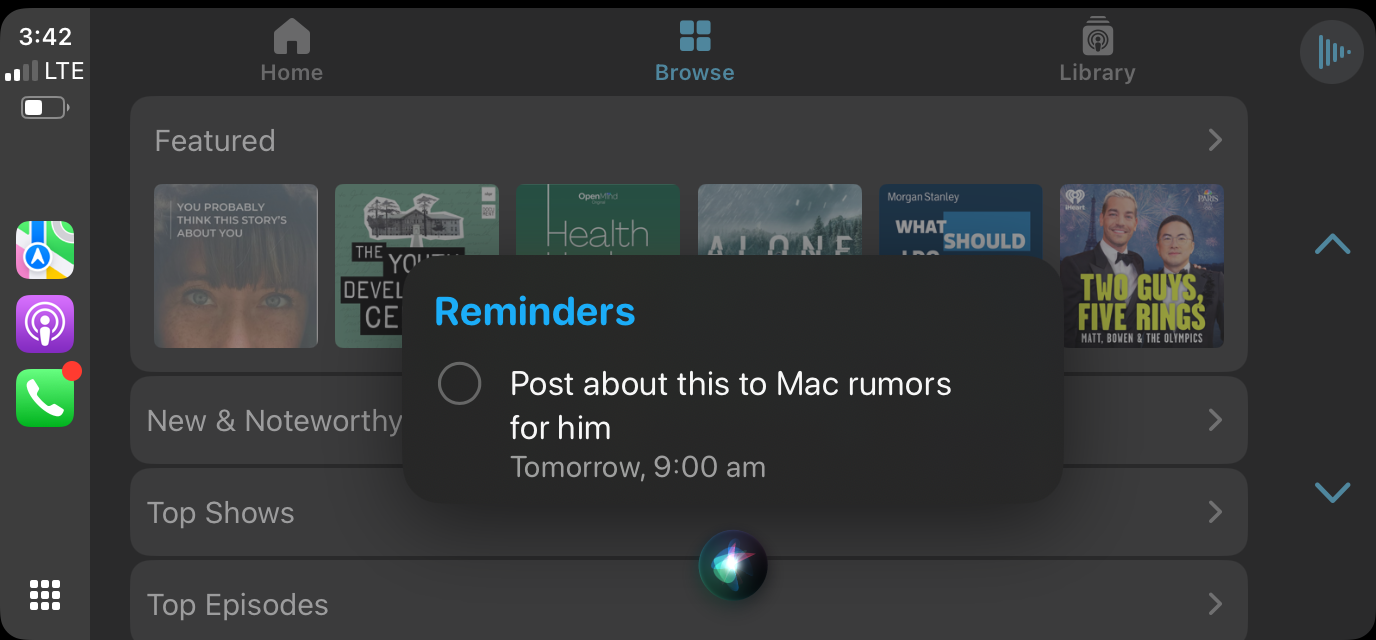 Siri also shows cards like this for the weather, and I think Messages (?).When creating a reminder in the Reminders app via Siri on CarPlay, you now get a different dialog showing the reminder created. I think this has more detail than in iOS 17. But Siri is still Siri (and messed up "forum" to "for him"). 😂