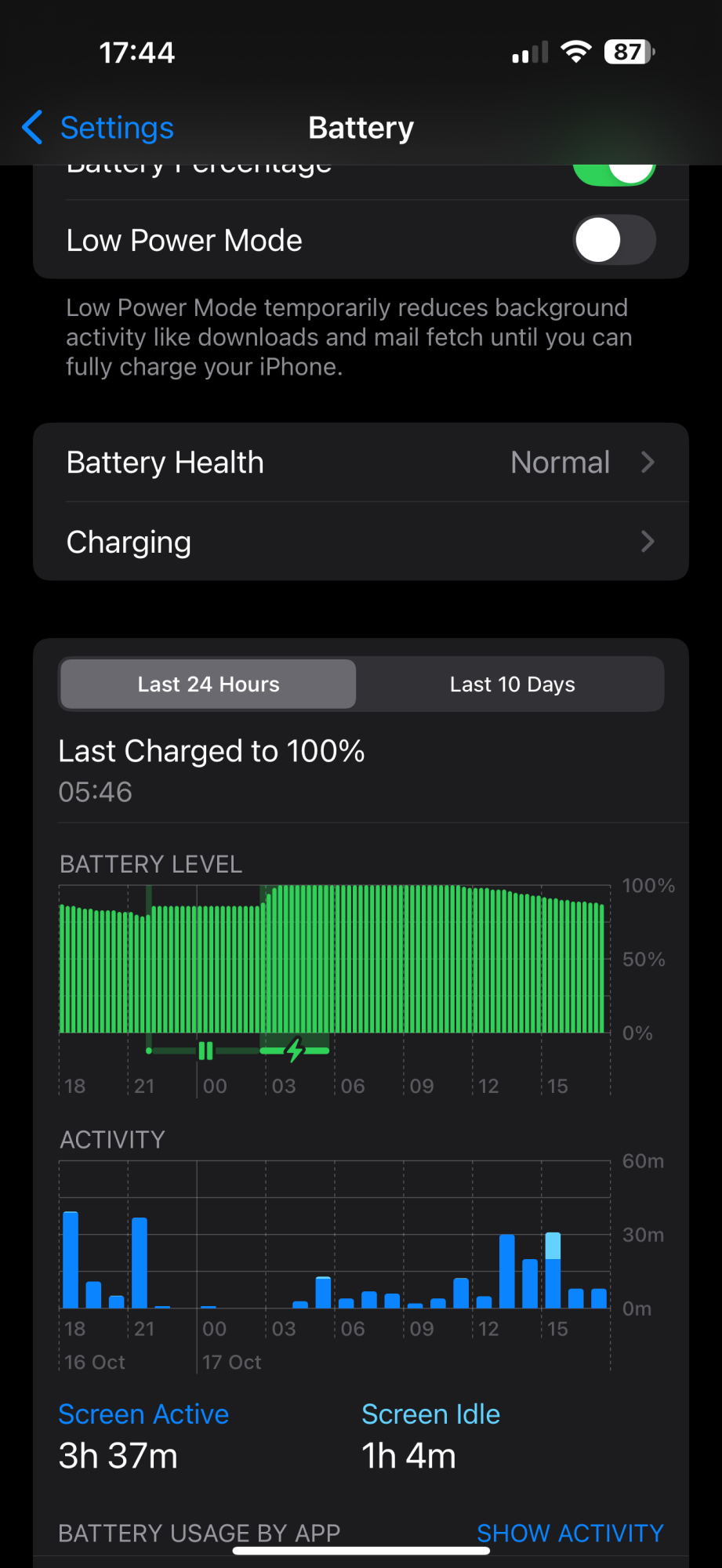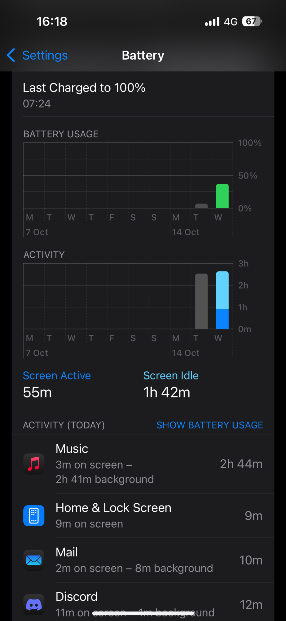 Give it some time. There’s a lot going in the background when you set it up. You should see an improvement in the next couple days.iPhone 14 Pro was wiped yesterday, fresh install, no backups loaded, only 3 Apps downloaded and this is what I’m seeing: took it off the charger at 07.24 now it’s 16.20. Down to 67% after only 55 min of SoT and 2h44m of music. Same crap as per usual, worse than an iPod. I’m using wifi at work, phone is on the table, and everything else is being accessed from my desktop (chat, mail, news, etc.). I give up. I guess I’ll have to charge it multiple times throughout the day and carry a battery. View attachment 2438138