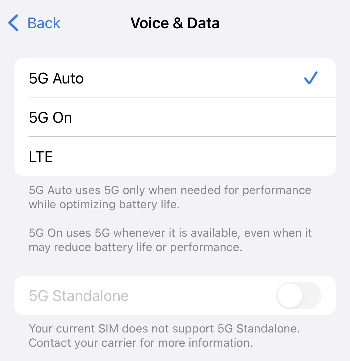 5G standalone is greyed out for me on AT&T and from what I’ve read thus far that setting should be off anyways but what I was referring to above in my previous post is that some YouTubers have made the suggestion to select LTE under the cellular settings page instead of 5G Auto and that it would save a great deal of battery life. If that’s the case, why isn’t everyone doing it? Have any of you tried that? Does visual voicemail and all functions of the iPhone work the same on LTE only with the only exception being the slightly slower data speeds?Turning off 5G definitely saves battery as it’s not a 5G SA. The way it is right now it still has to connect to both 4G for voice and 5G for data which would be a drain.