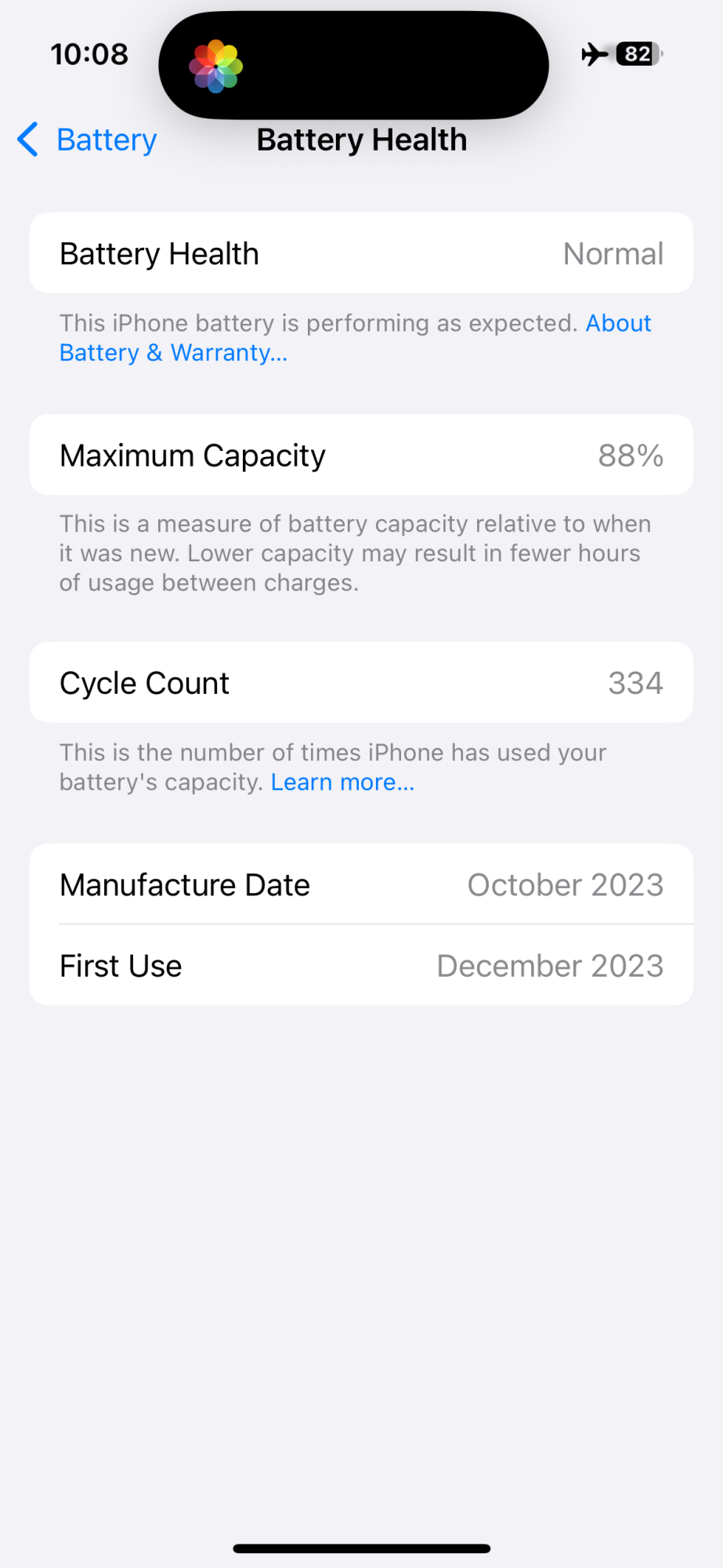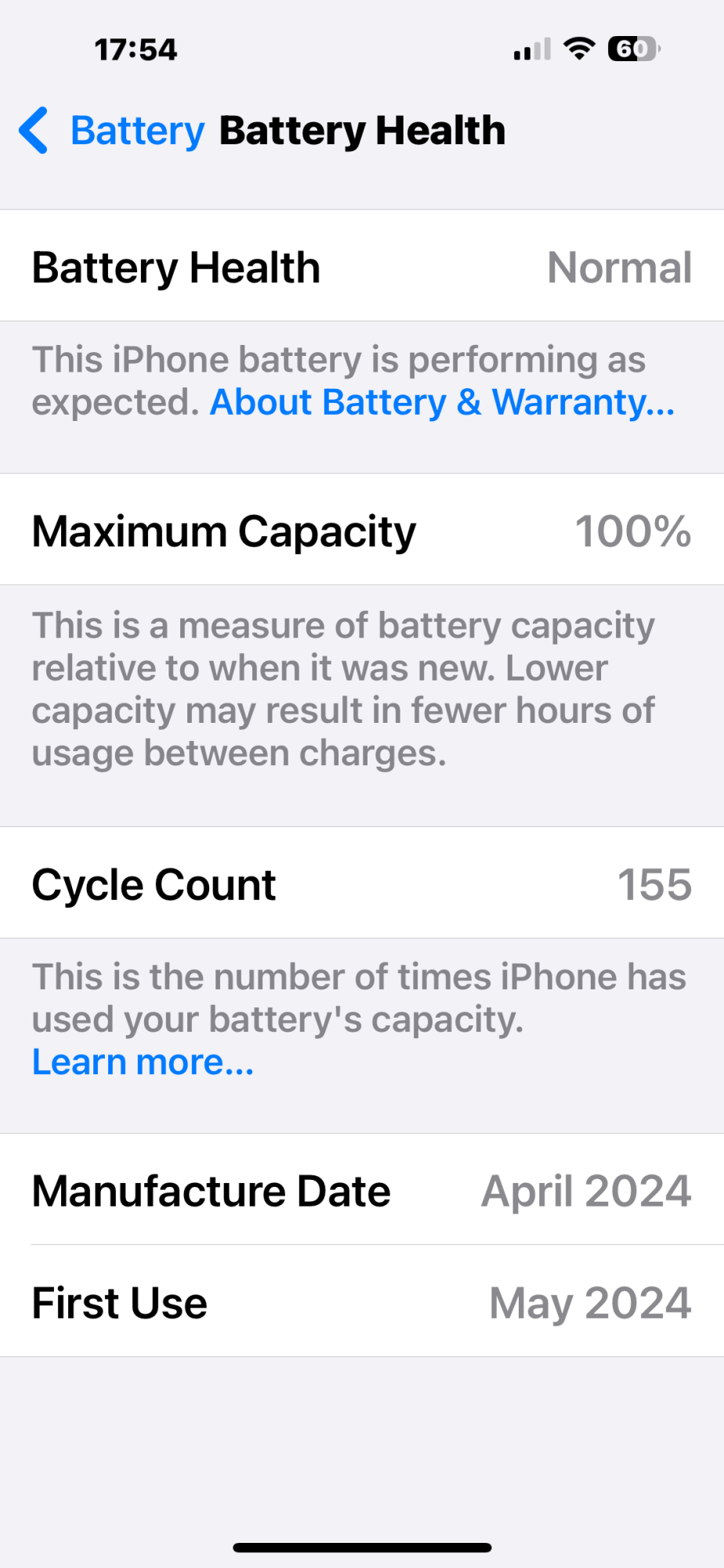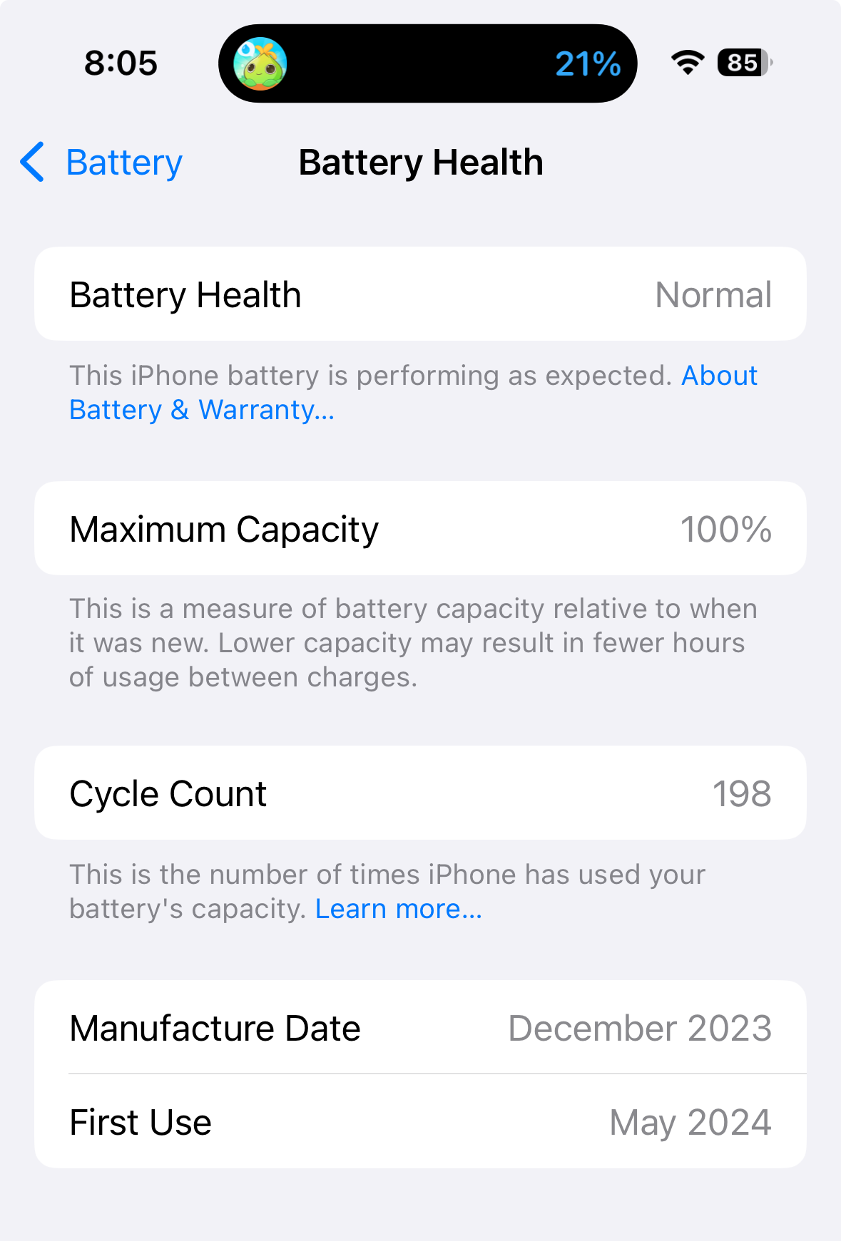 Here’s the cycle count and battery health of my iPhone 15 Pro: