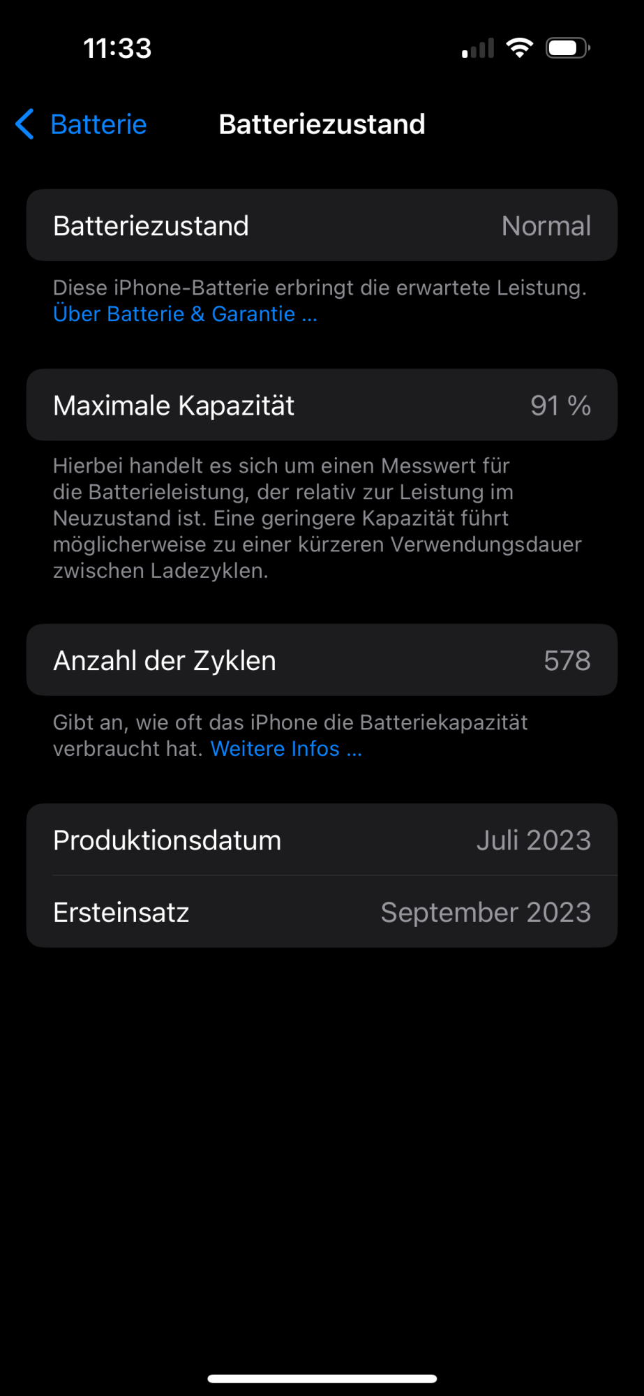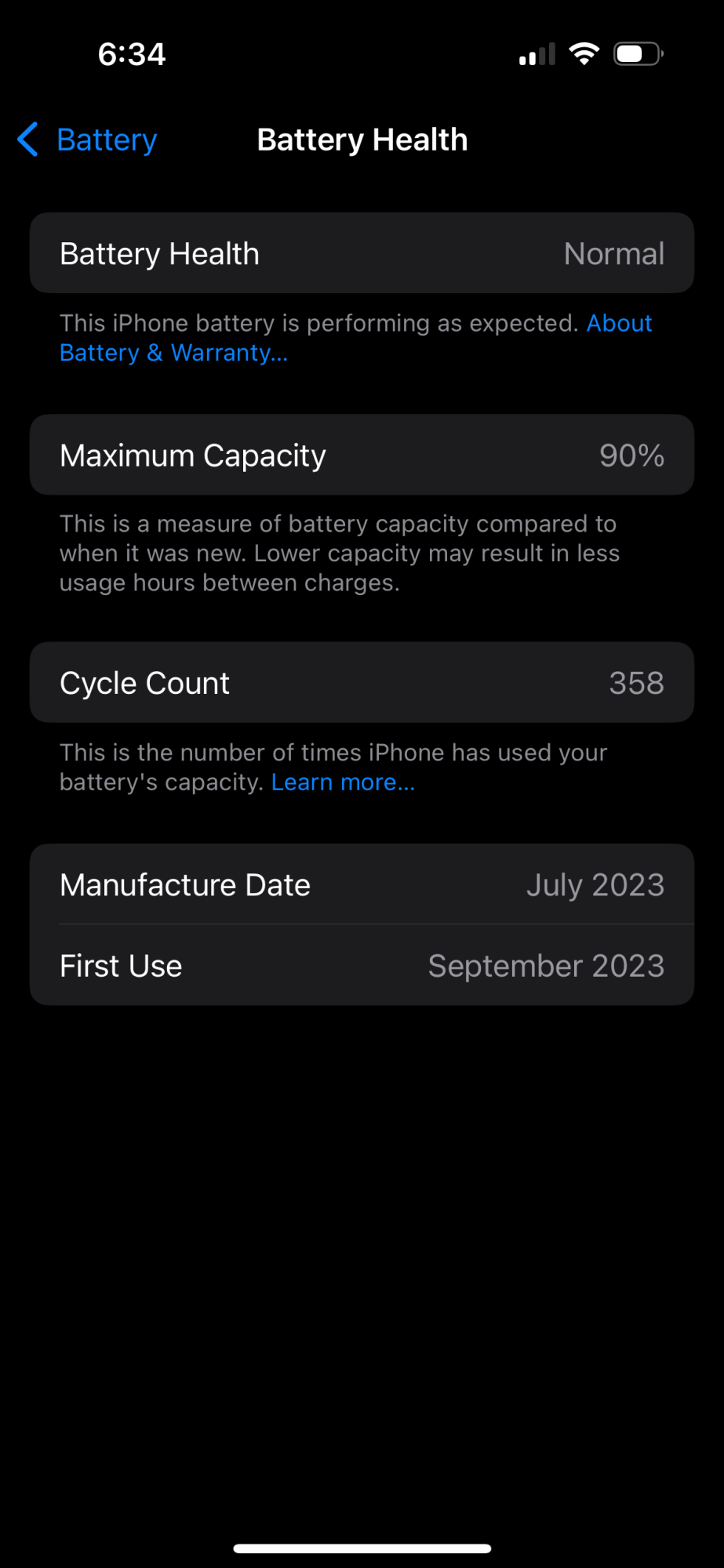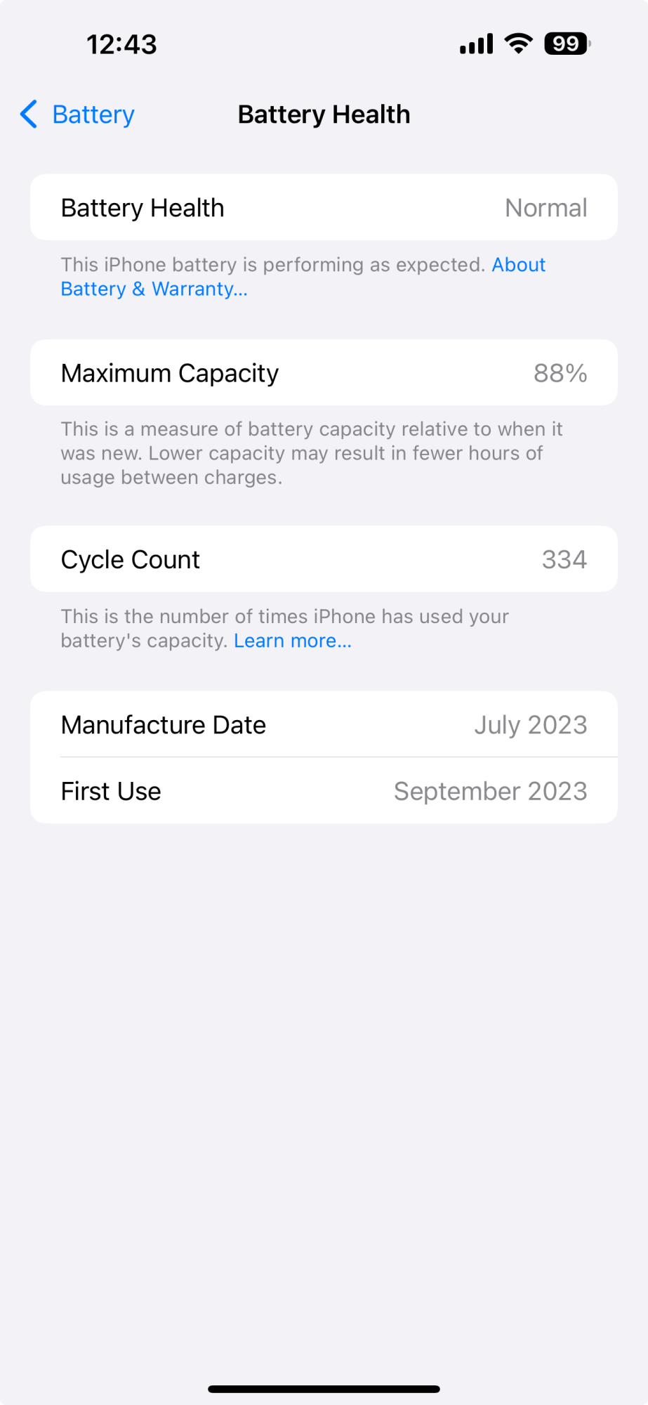 Here’s the cycle count and battery health of my iPhone 15 Pro: