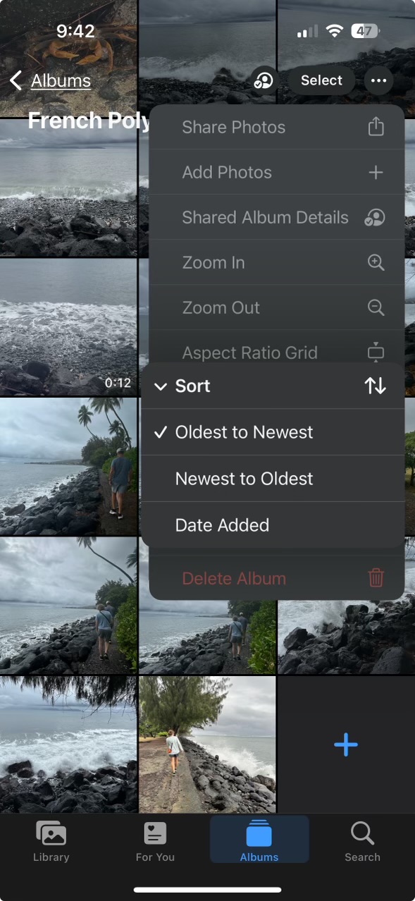Thanks - I did find this on the iPhone but not in iPadOS. I was hoping it was on he iPad so I can put those in order.This menu moved to the left down corner, right in the album, there you should be able to sort the pictures: