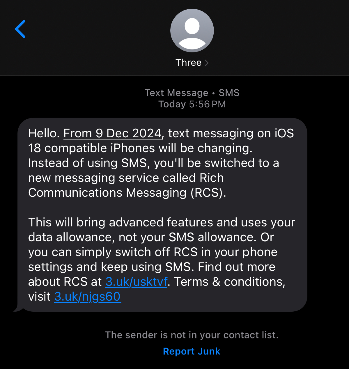If you’re on the latest beta that enabled the RCS options for Three UK, not sure if it’s showing for Three IE?Cool heads-up. I'm on Three Ireland but betting they will follow closely along.