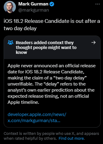 You mean the one who was just community noted for claiming Apple “delayed” the iOS 18.2 RC because the release didn’t line up with his wrong guess? 😂👍🏻Suggestion from the usual trusted poster on X that there may be a new build of 18.2 when released to the public.