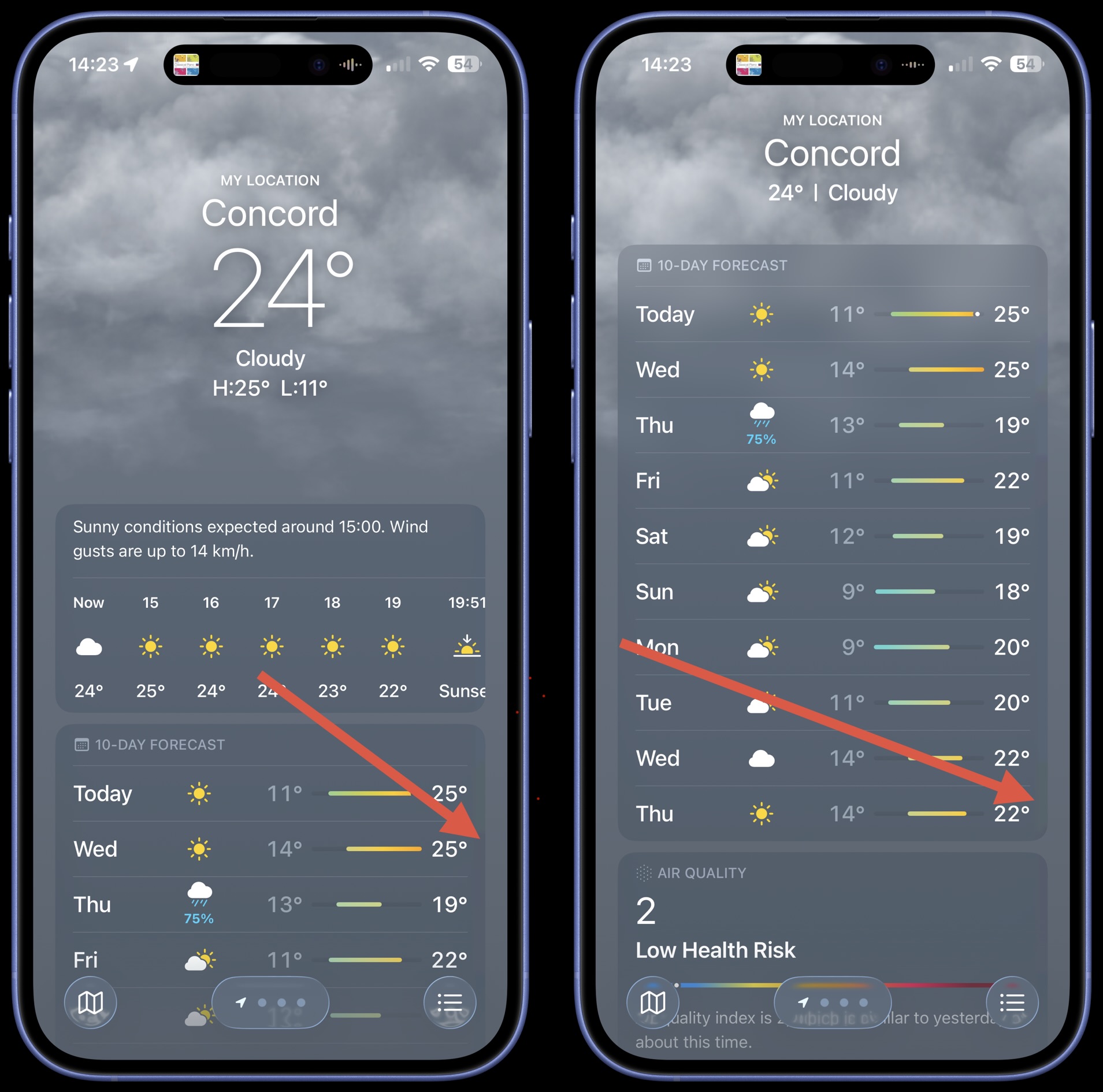 This weird rendering bug in the Weather app where color bands appear at the right side of each weather card has been around since Beta 6 and still present on Beta 9.