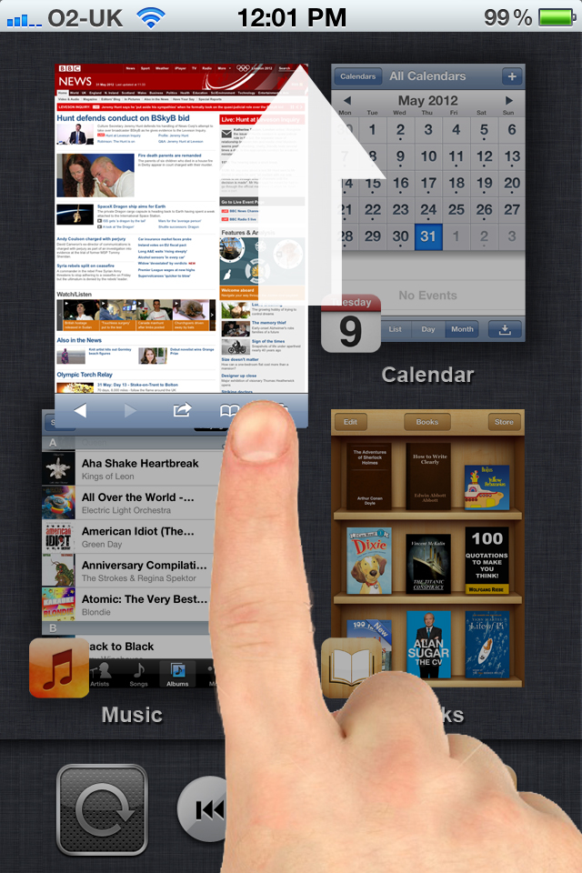 Hey. I did some mockups for a new multi-tasking system in iOS - akin to a simplified version of mission control from OSX. It is activated by either the four finger swipe up (replacing the current multitasking bar at current) or by double tapping the home button. There are multiple pages of your recently opened apps and works similarly to the current implementation, only I believe slightly more practical, efficient and aesthetically pleasing. The tiles of apps are from where you last left them, and similar to the current implementation: pause when you leave them. You obviously just tap on a tile and it expands to take the full screen.
