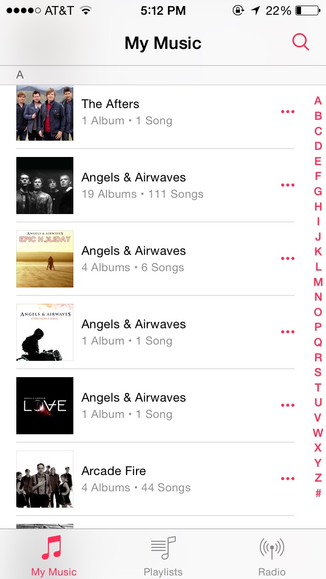 There were a few other artists that were split like this as well, but I've been able to fix all but this one by changing the metadata and then changing it back. For the life of me though no matter how much I fiddle with it I can't get Angels & Airwaves to show correctly.