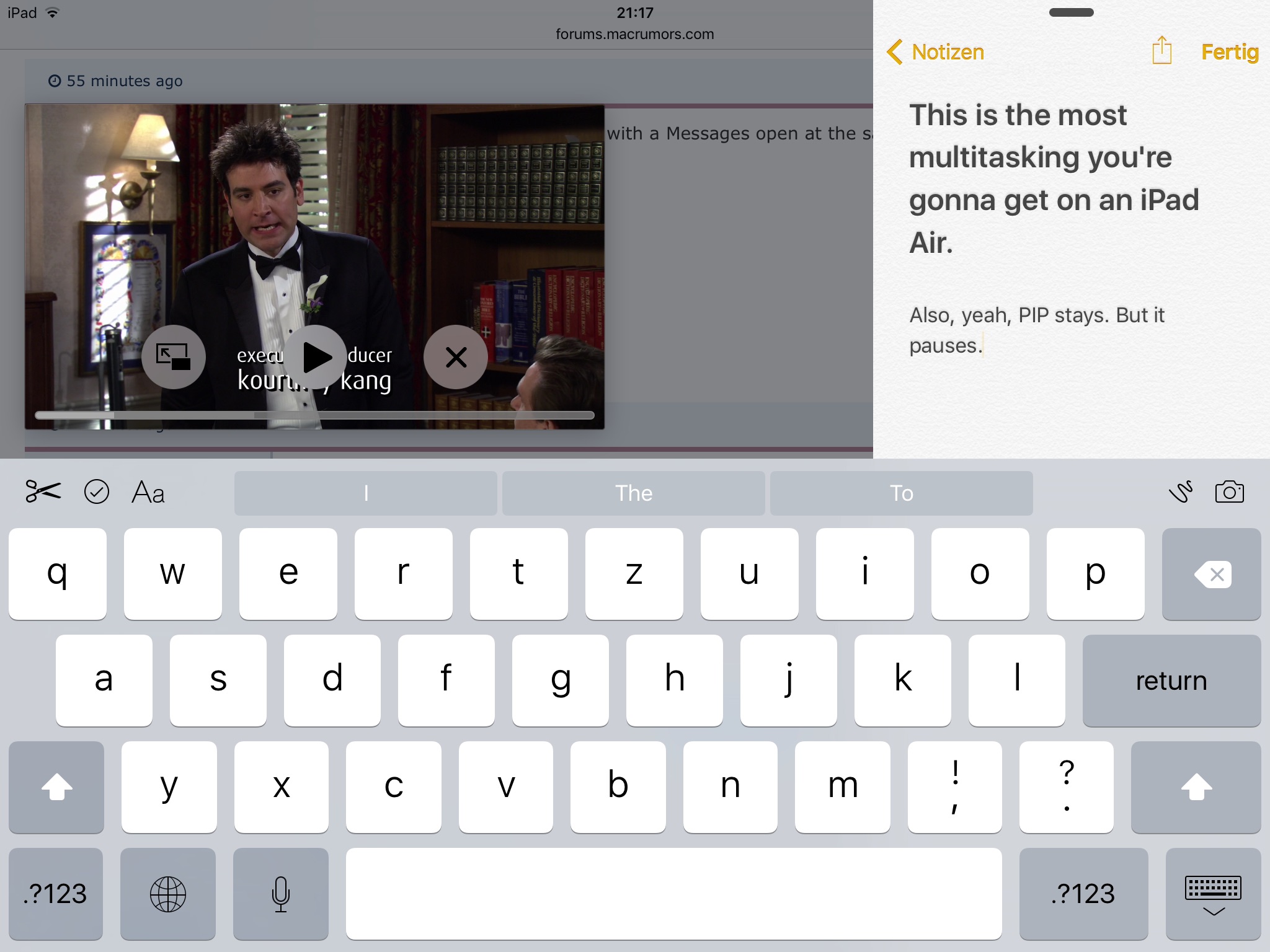 Thanks for the explanation. I also thought it seemed that the older iPad Air and iPad mini 2,3 also got full interactive features with Slide Over and PIP but it seems it doesn't which is a shame but probably has to do with the lack of RAM and processing power then.