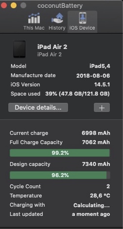 I've had my iPad Air 2 for several years and used it a lot. Recently I noticed that the battery life was starting to decline (750 cycles).